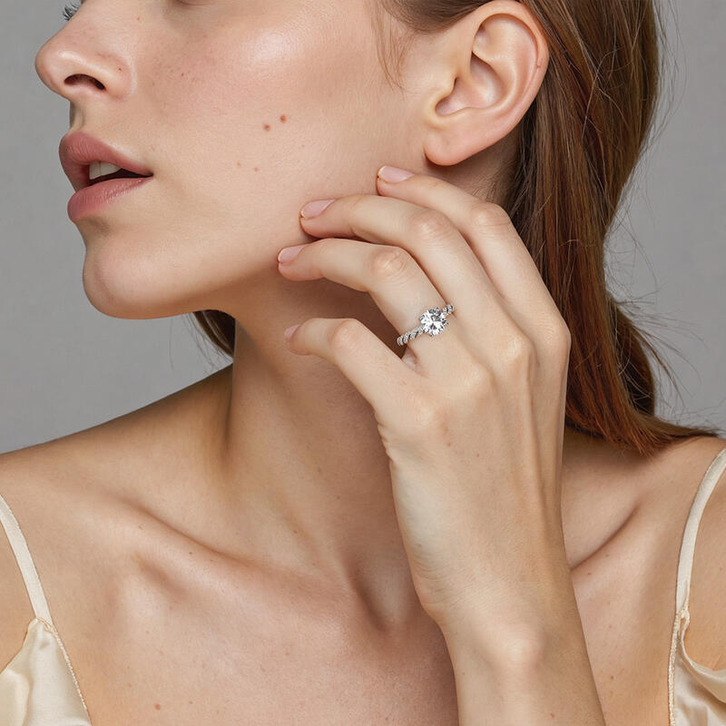 Elevate the moment of a lifetime with this captivating engagement ring, showcasing a dazzling round-cut center stone that captures the essence of everlasting love. The mesmerizing beauty of the centerpiece is further enhanced by the twisted pave shank, which adds a unique and modern touch to this classic design. Expertly crafted with precision and attention to detail, this enchanting ring symbolizes the intertwining journey of two souls destined to be forever united.