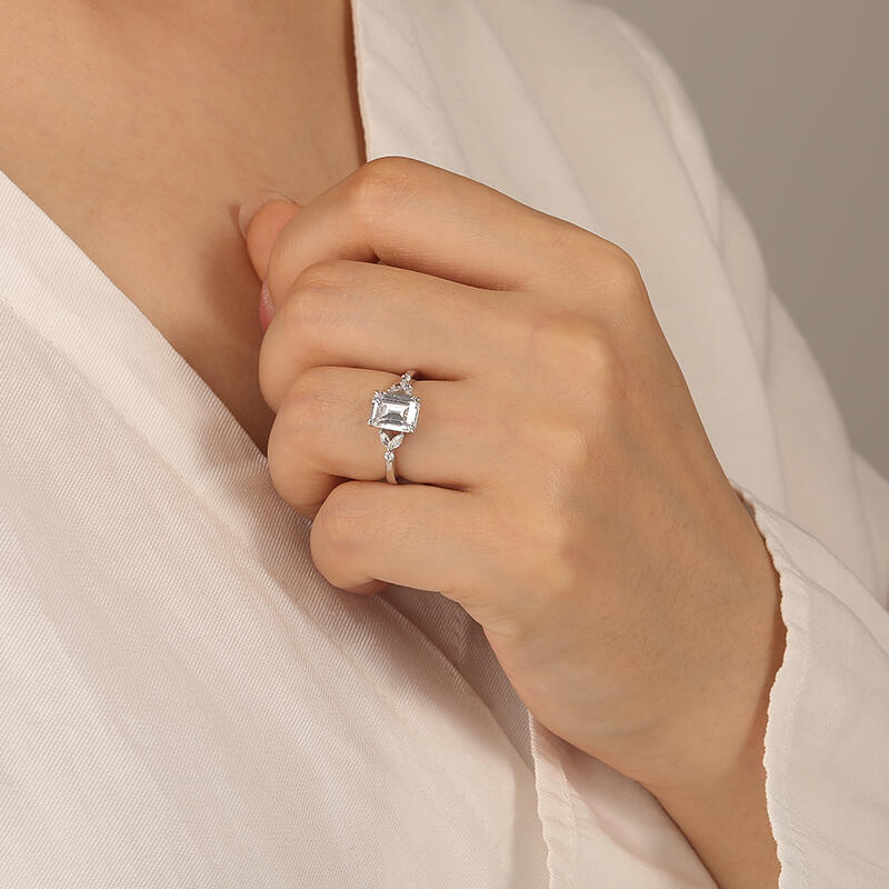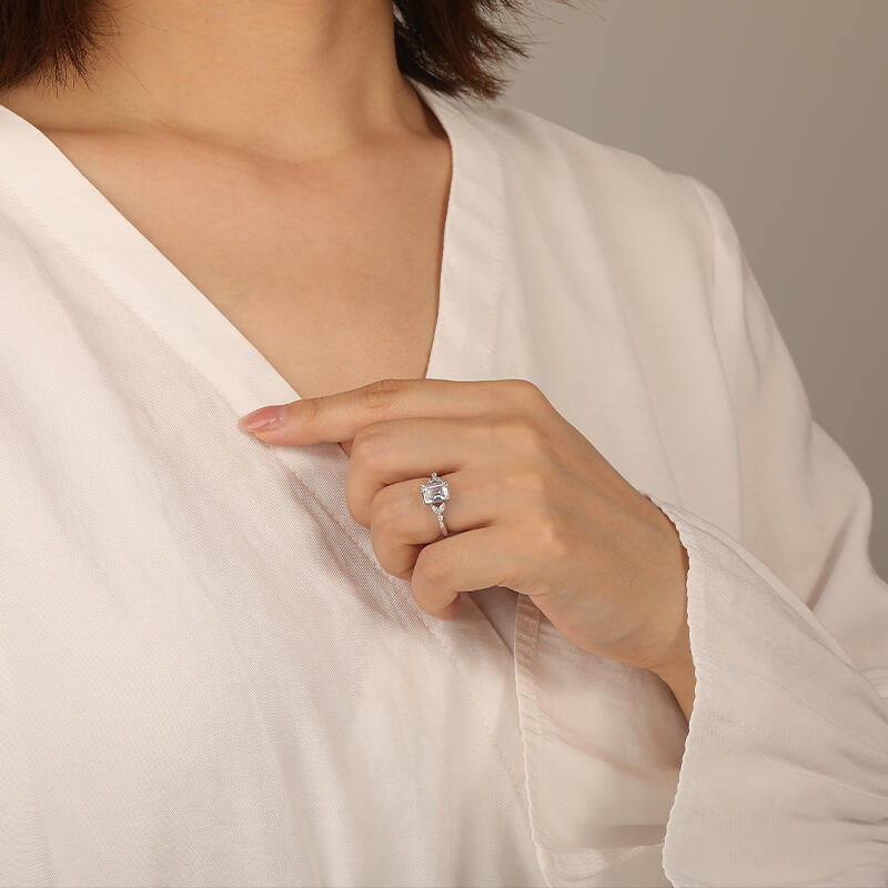 This side-stone engagement ring features a captivating emerald-cut center stone, surrounded by an artful arrangement of marquise and round accent stones, adding a unique charm. Each detail is meticulously crafted to create a stunning symbol of love. This exquisite piece embodies elegance, making it a perfect choice for those seeking a timeless and sophisticated statement of commitment.