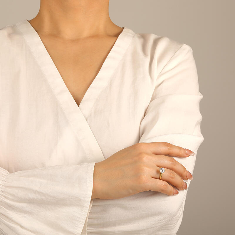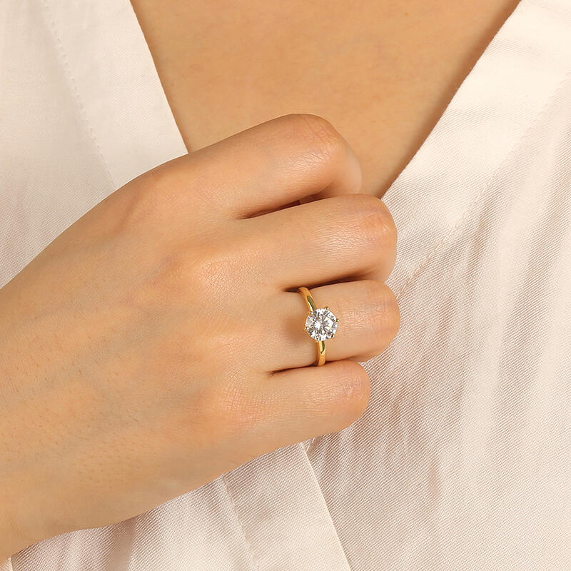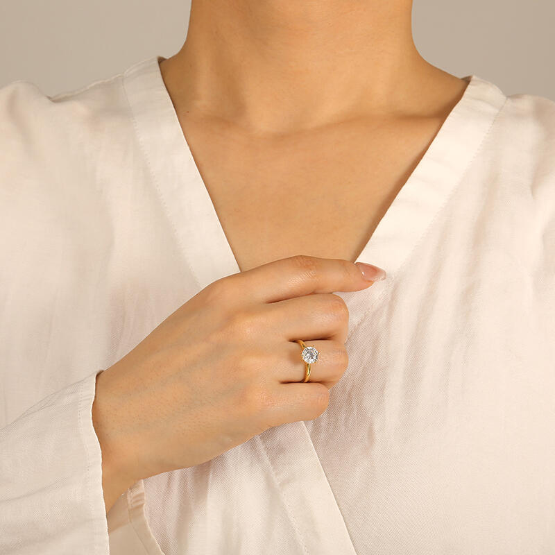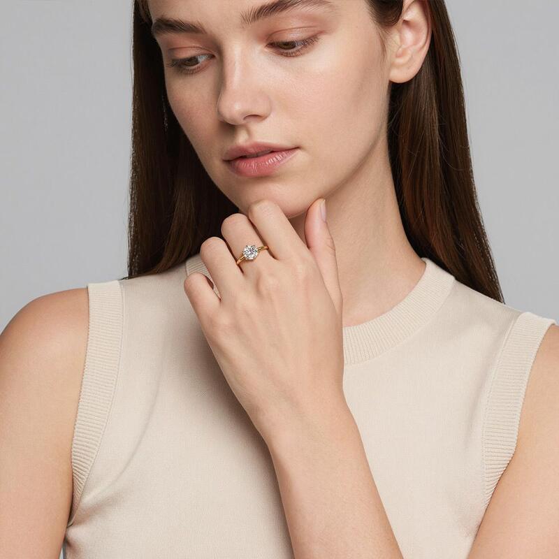 Classic and chic, this solitaire engagement ring accents a glittering round-cut center stone with a hidden halo around the prongs. Without too many gorgeous words, she will also be moved by your sincere heart. This piece is what you need for your big day!
