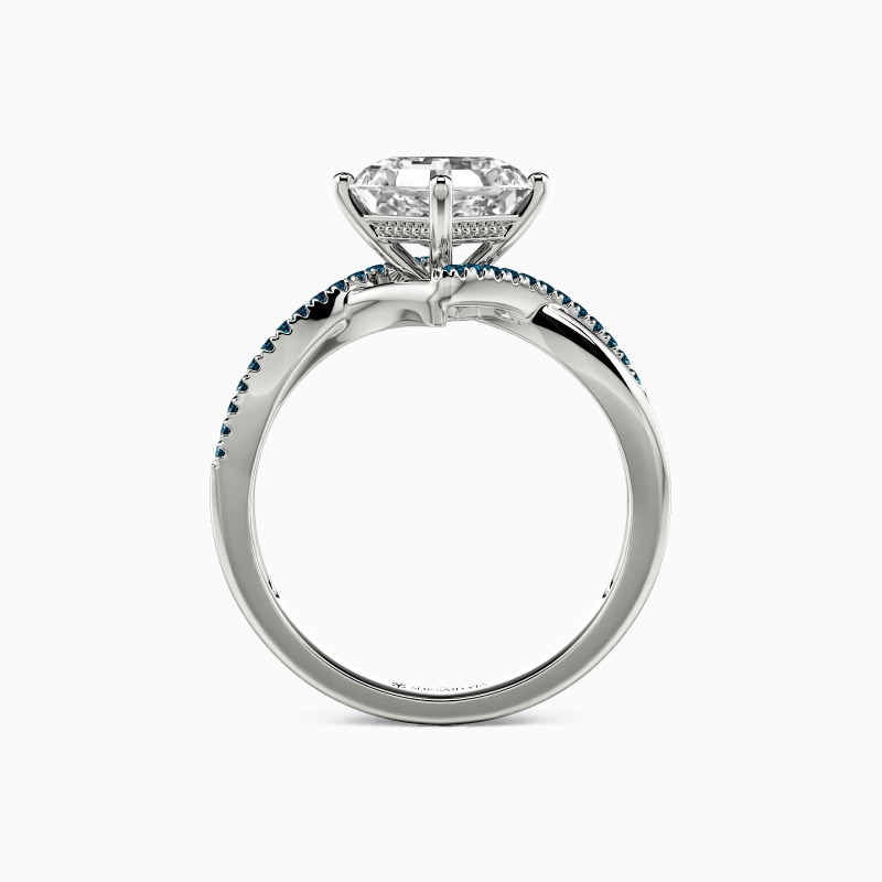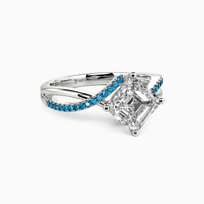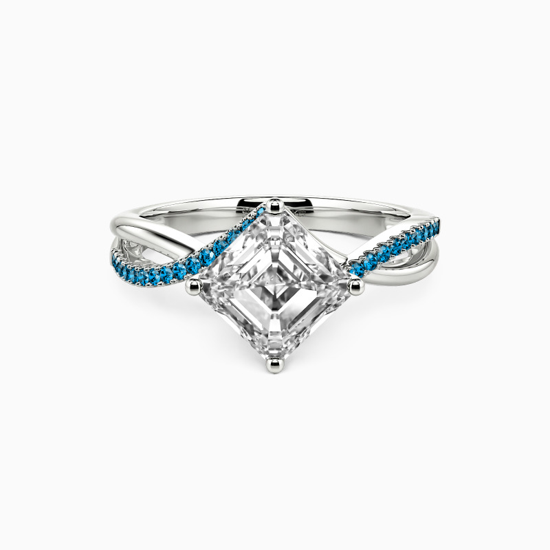 This engagement ring is a testament to elegance, featuring an asscher-cut centerpiece. Its shank intertwines a polished band with a gem-studded one, creating a unique twist. The sparkling accents complement the center gem, enhancing its brilliance. This ring's unique design and sophisticated style make it an excellent symbol of a timeless and enduring love promise.