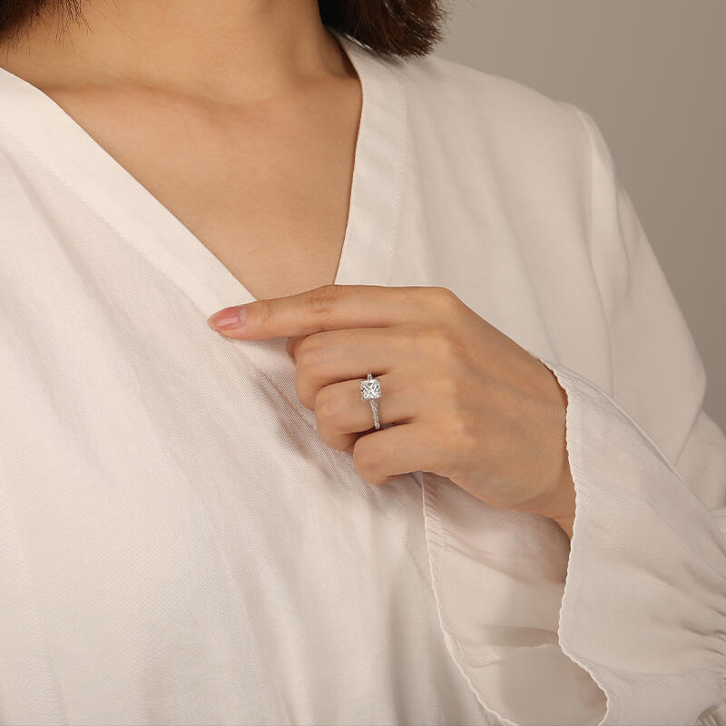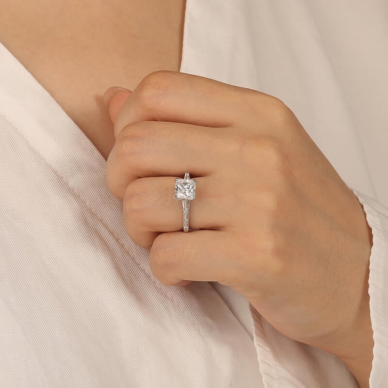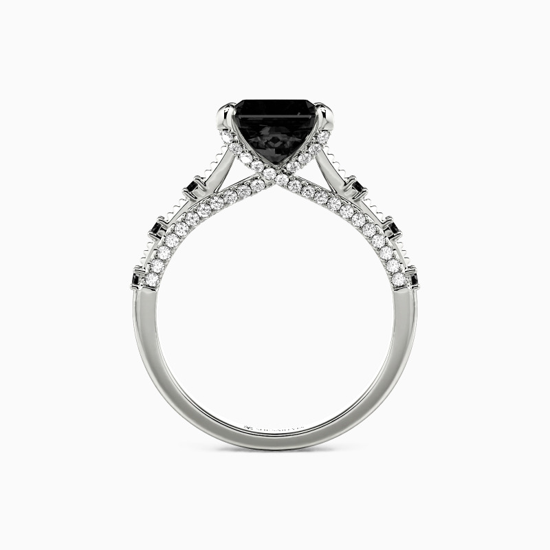 Elevate your love story with our exquisite side-stone engagement ring. Featuring a dazzling radiant-cut center stone embraced by a cathedral design, its crossover paved profile exudes elegance. Meticulously crafted shoulders shine with three gems on each side, symbolizing past, present, and future. Celebrate your journey with this timeless masterpiece, a testament to your enduring commitment.