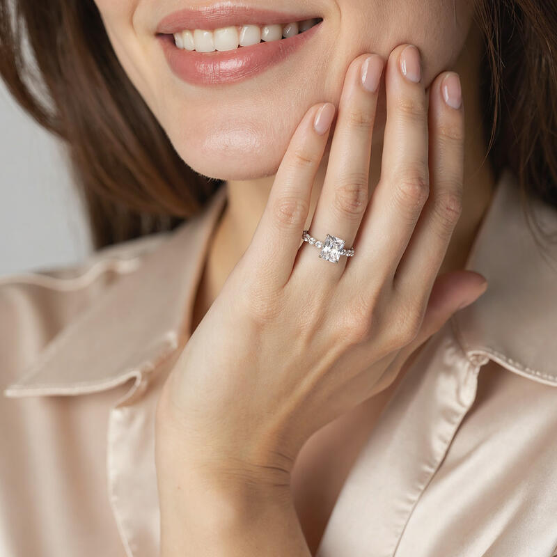 This stunning engagement ring features a radiant-cut center stone, gracefully resting on a four-prong setting. The single-prong side stones further accentuate its beauty, adding exceptional sparkle and shine. Adding to its charm and beauty, the ring also boasts a hidden halo surrounding the center, providing an elegant and subtle accent. This engagement ring is perfect for those seeking to make a statement with their unique style and timeless elegance.