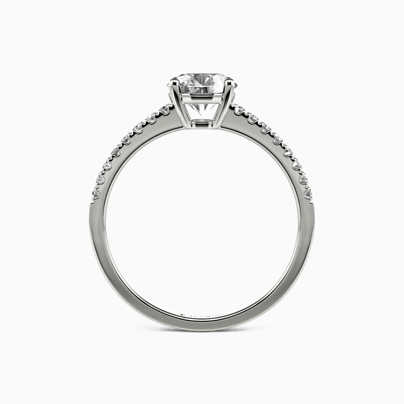 Simple and classic. A graceful engagement ring featuring a glistening Round stone in the setting with a gold contrast around the main stone. Additional accents line the gold band. This one pair nicely with a multitude of our wedding bands. Promise to love her with this ring as long as the stars twinkle in the sky, as long as angels are there up high.