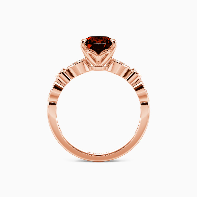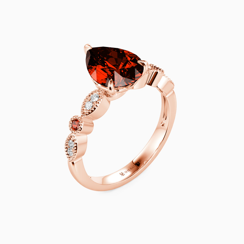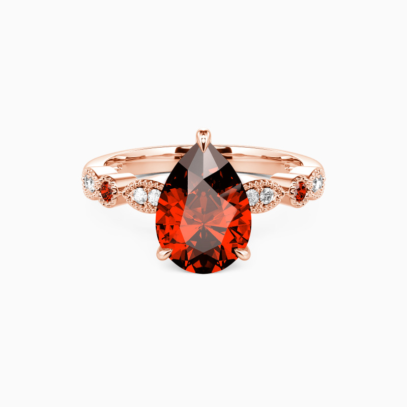 An ode to timeless love, this engagement ring features a pear-cut stone at its heart. Cradled within an intricate basket, it reflects a promise of lifelong commitment. Round gems dot the scalloped band, their sparkle mirrored in the center stone. Milgrain detailing adds a final touch, whispering tales of vintage charm in this classic yet unique design.