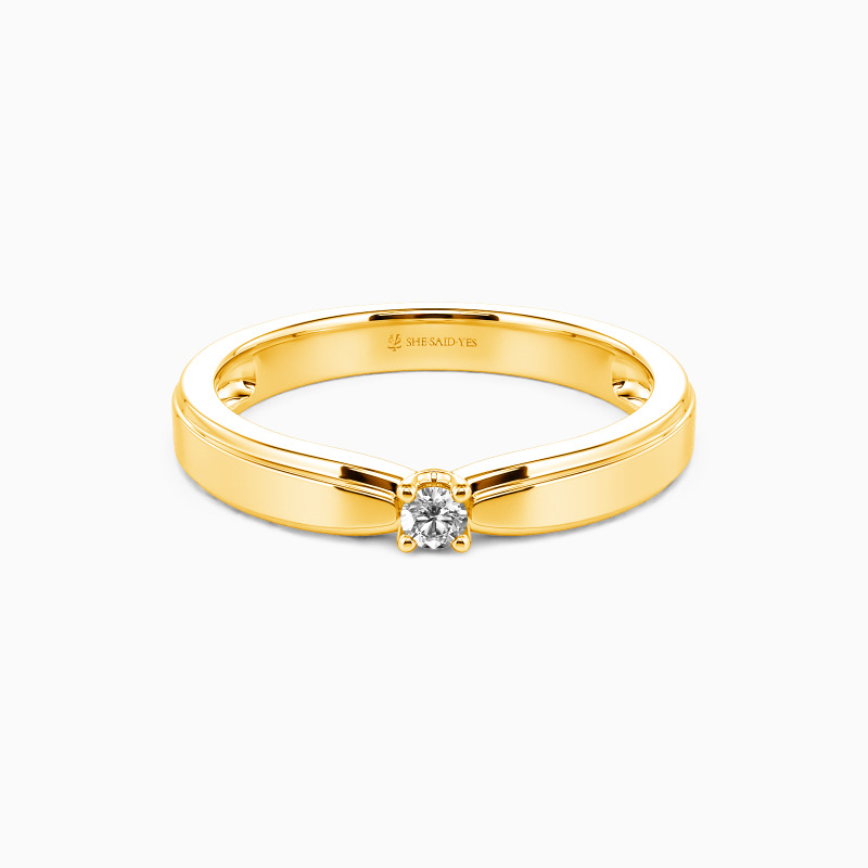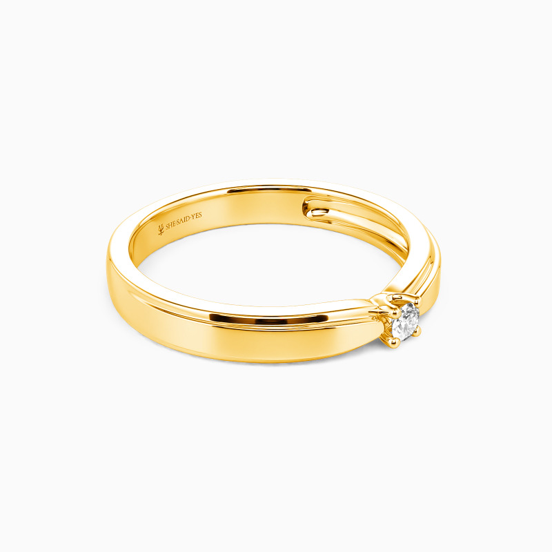 Timeless and distinguished, this men's wedding ring features a flawless high-polish finish, its bold silhouette accentuated by a single round gem in a refined prong setting. The interplay of mirrored metal and brilliant stone creates a striking yet understated elegance—ideal for the groom who values enduring style and quiet confidence.