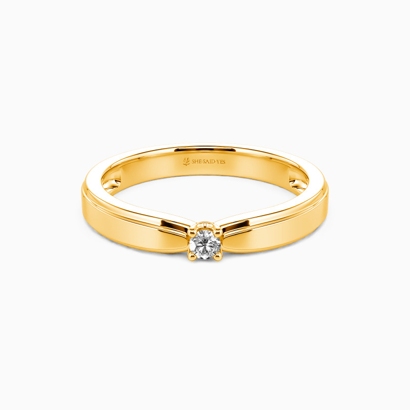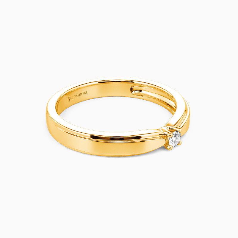 Timeless and distinguished, this men's wedding ring features a flawless high-polish finish, its bold silhouette accentuated by a single round gem in a refined prong setting. The interplay of mirrored metal and brilliant stone creates a striking yet understated elegance—ideal for the groom who values enduring style and quiet confidence.