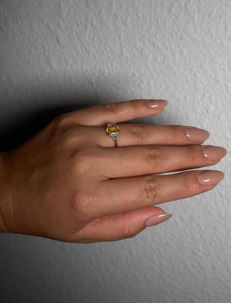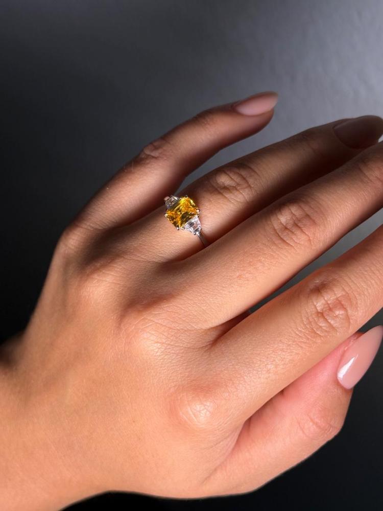 Catching your sight immediately with its dazzling glamour, this breathtaking engagement ring represents the ultimate beauty of the gemstone. It features a sizable stunning center stone in radiant-cut, closely flanked by two trapezoid-cut stones aside to elevate the brilliance. Set on a highly buffed shank, its unparalleled radiance definitely wins her heart.