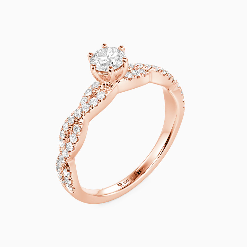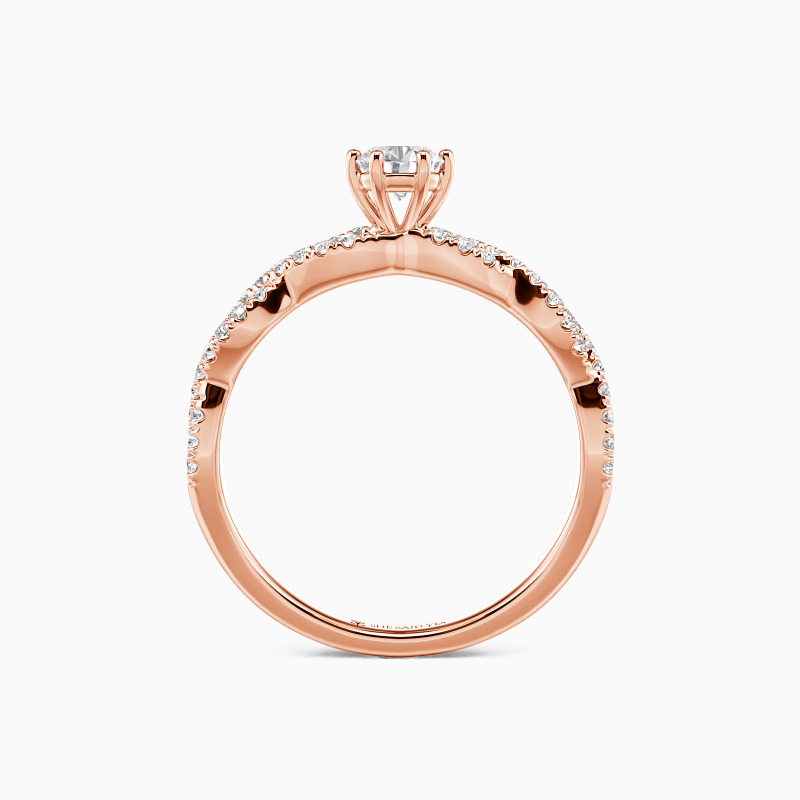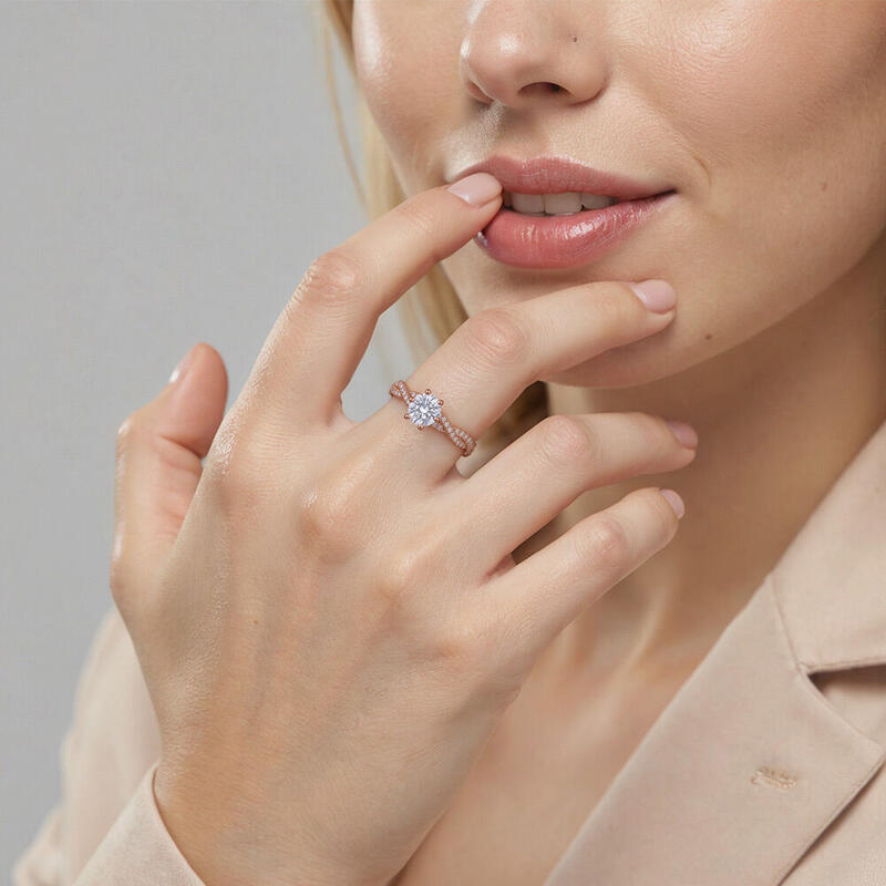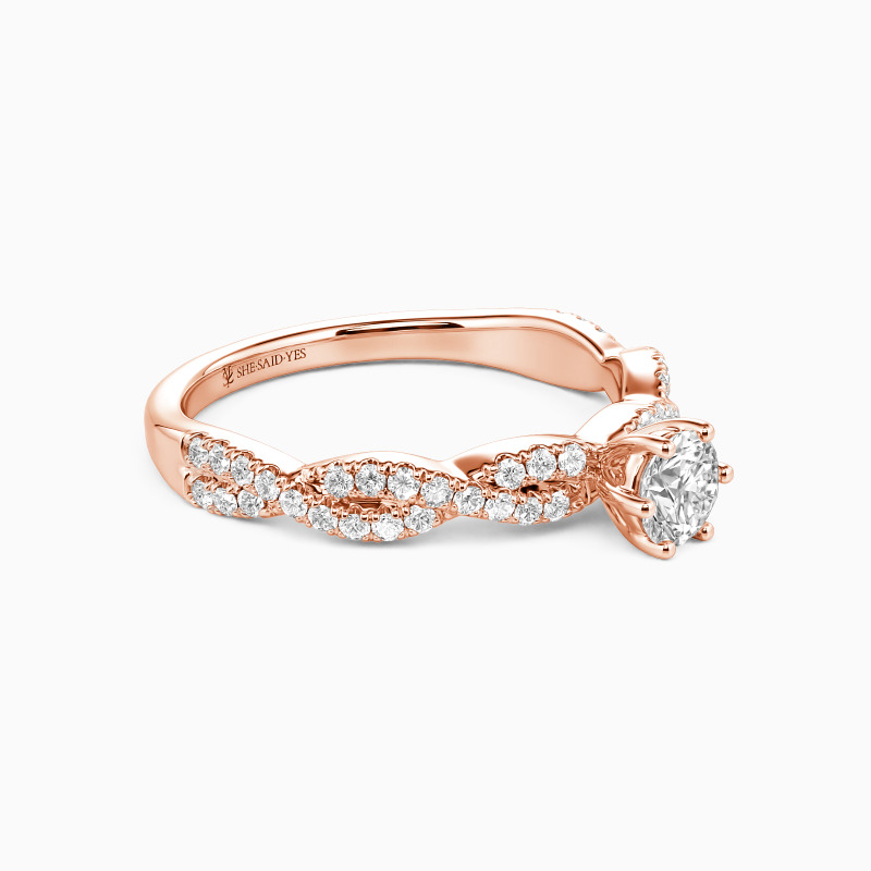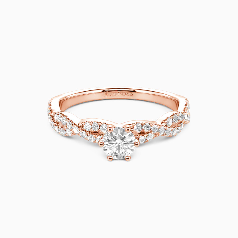 Classic and beautiful. This contemporary engagement ring features a scintillating round-cut center stone that towers highly in polished claws. And the elegantly intertwined shank is paved with glimmering gems for added radiance. It's the perfect choice for your romantic proposal.