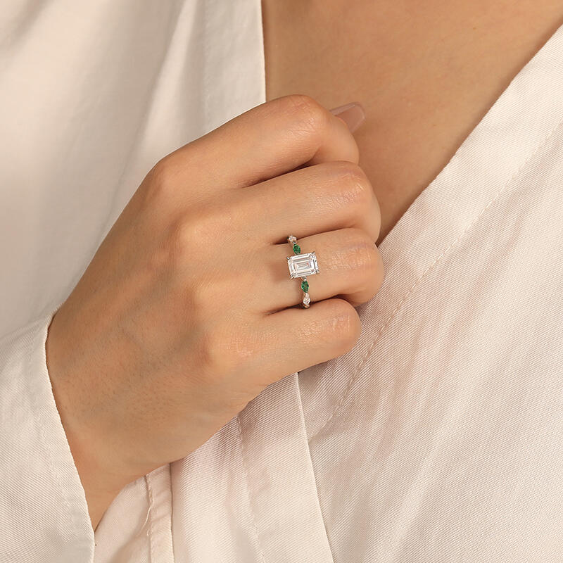 This side-stone engagement ring captivates with its refined elegance. The centerpiece, an emerald-cut stone, exudes a classic charm, subtly enhanced by a hidden halo. Marquise side stones contribute to the unique design, adding an intriguing visual dynamic. As a symbol of enduring love, this ring beautifully mirrors the depth and strength of the bond it signifies.