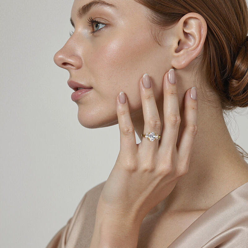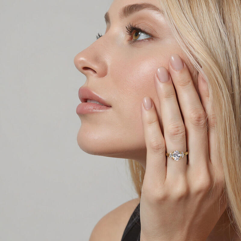 This timeless engagement ring calls for unforgettable memories in one's life. Featuring a classical three-stone design, a brilliant oval-shaped center gem is flanked by double smaller stones in the same shape. Crafted with a straight shank, it highlights a modern, feminine style fitting for every bride-to-be.