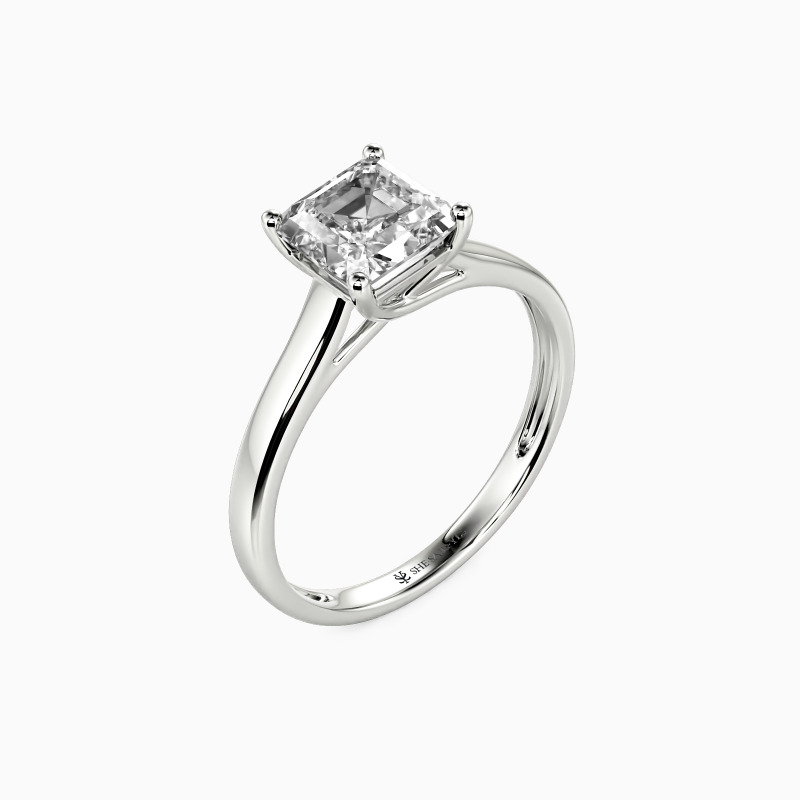 Simple yet divine, ask for her hand with this delicate solitaire. Standing tall in a traditional four-prong setting, a stylish Asscher-cut center stone radiates exceptional sparkle. An amazing look for the woman you adore, this engagement ring is finished with a shining polished shine.