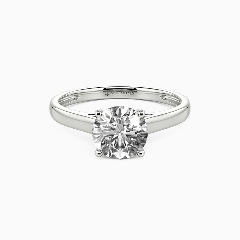 Simple yet divine, ask for her hand with this delicate solitaire. Standing tall in a traditional four-prong setting, a stylish round-cut center stone radiates exceptional sparkle. An amazing look for the woman you adore, this engagement ring is finished with a shining polished shine.