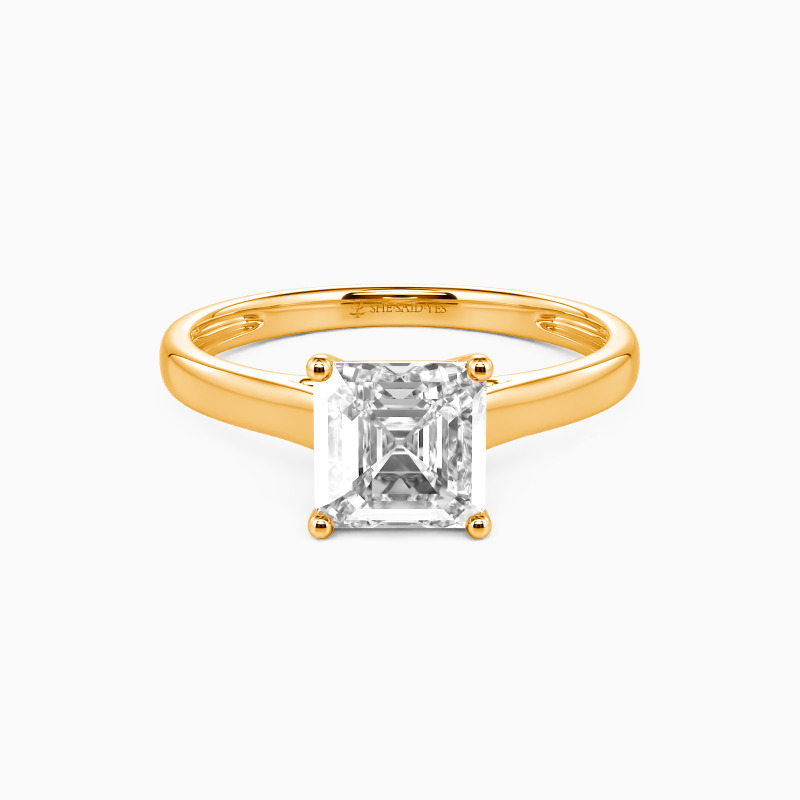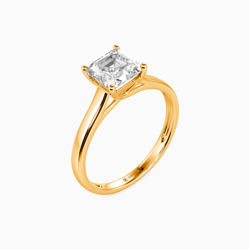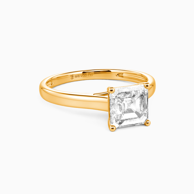 Simple yet divine, ask for her hand with this delicate solitaire. Standing tall in a traditional four-prong setting, a stylish Asscher-cut center stone radiates exceptional sparkle. An amazing look for the woman you adore, this engagement ring is finished with a shining polished shine.