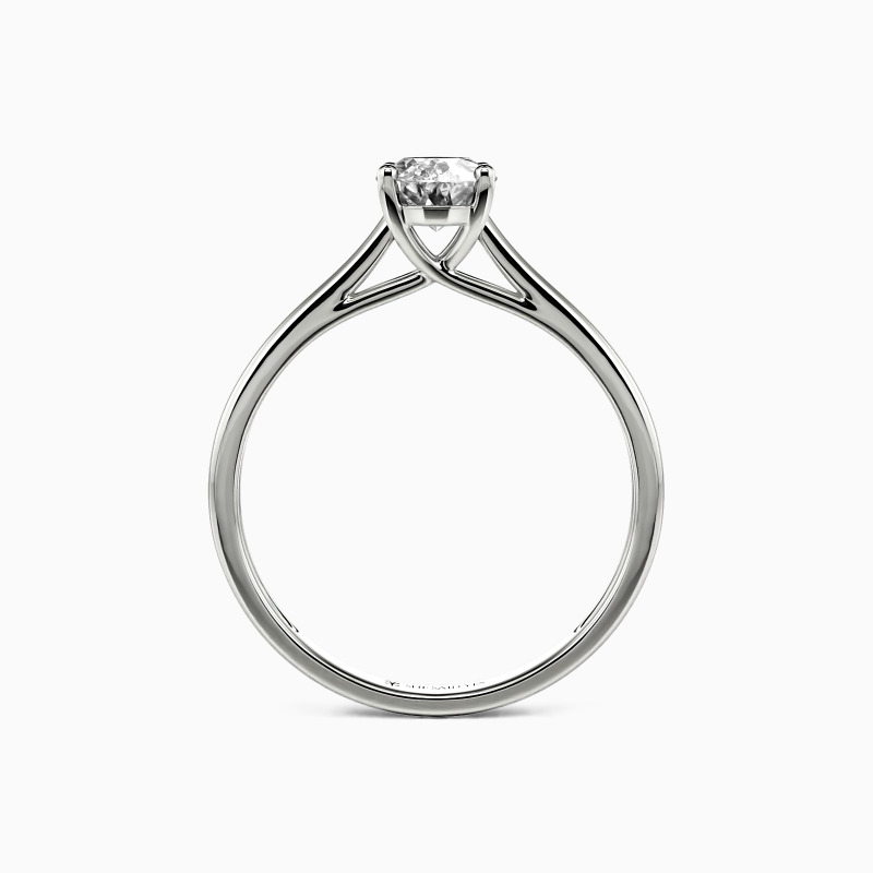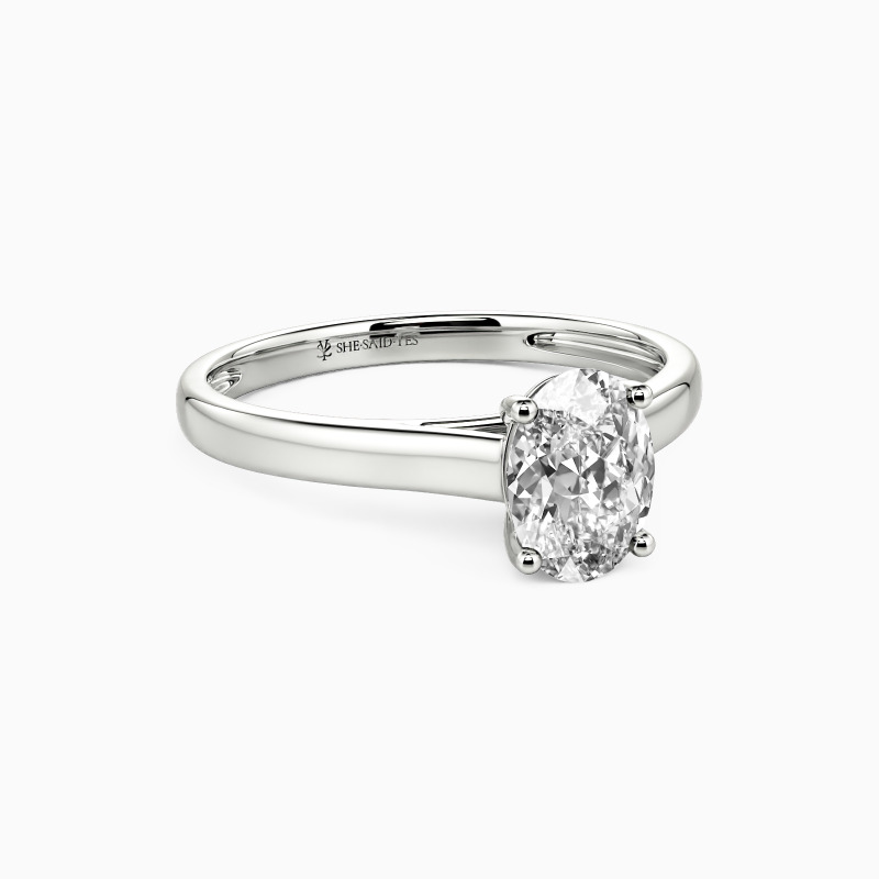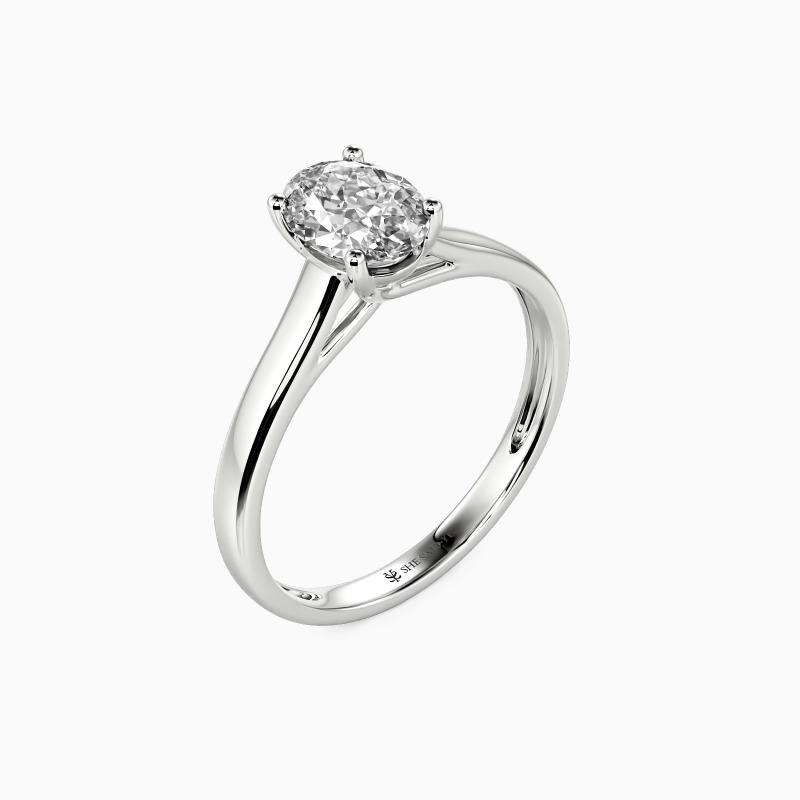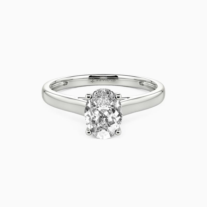 Simple yet divine, ask for her hand with this delicate solitaire. Standing tall in a traditional four-prong setting, a stylish oval-cut center stone radiates exceptional sparkle. An amazing look for the woman you adore, this engagement ring is finished with a shining polished shine.