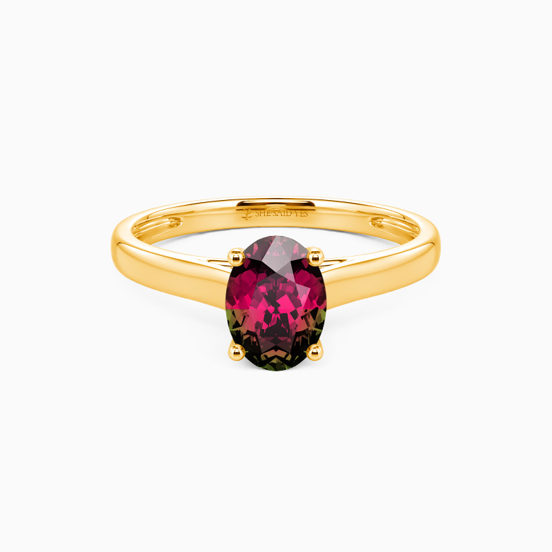 Simple yet divine, ask for her hand with this delicate solitaire. Standing tall in a traditional four-prong setting, a stylish oval-cut center stone radiates exceptional sparkle. An amazing look for the woman you adore, this engagement ring is finished with a shining polished shine.