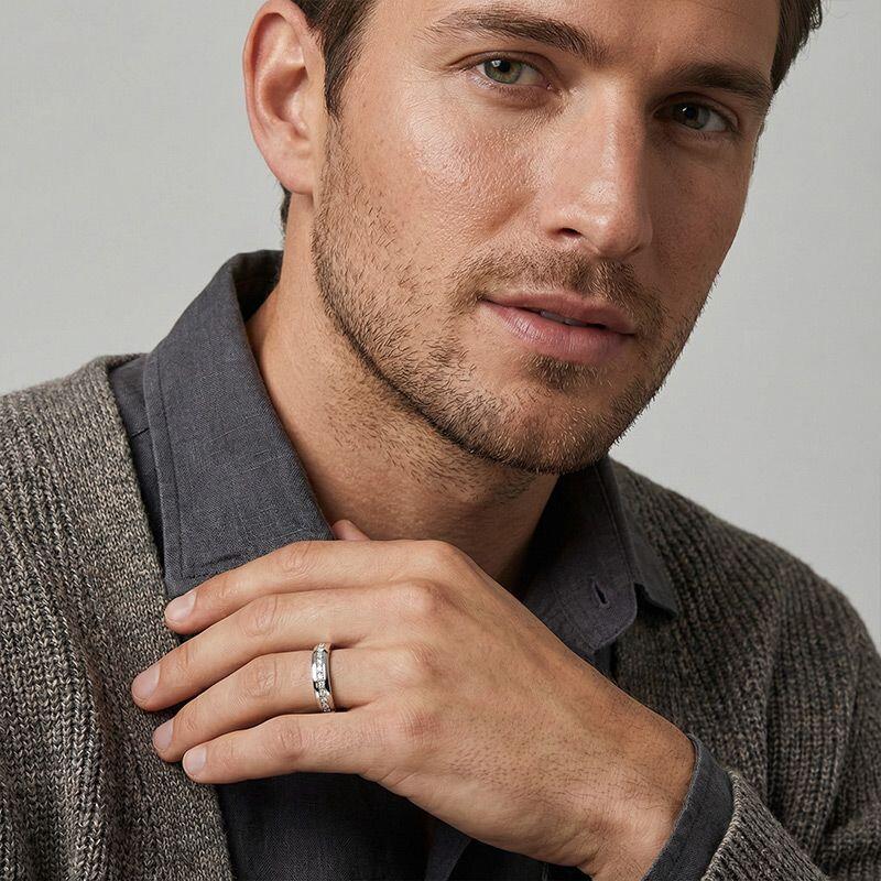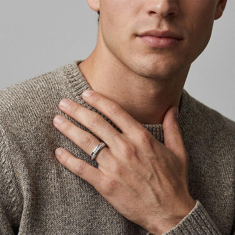 This men's wedding band melds masculine elegance with sparkle. Expertly crafted, it features a row of shimmering gemstones set against a sleek finish. A comfortable yet luxurious piece, it's perfect for the modern man. Expressing your profound love to your beloved with this piece must be a cherished memory.