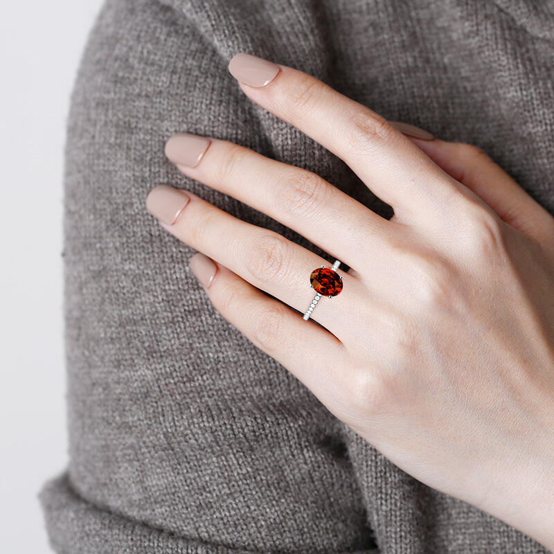 This captivating engagement ring features an elegant oval-cut center stone that draws the eye with its shapely sparkle. A concealed halo of tiny gemstones adds an artistic flourish. The band encrusted with a scattering of glistening stones brings continuous brilliance to the finger. This piece is a stunning ring to cherish through every milestone, upgraded only by vows of forever.