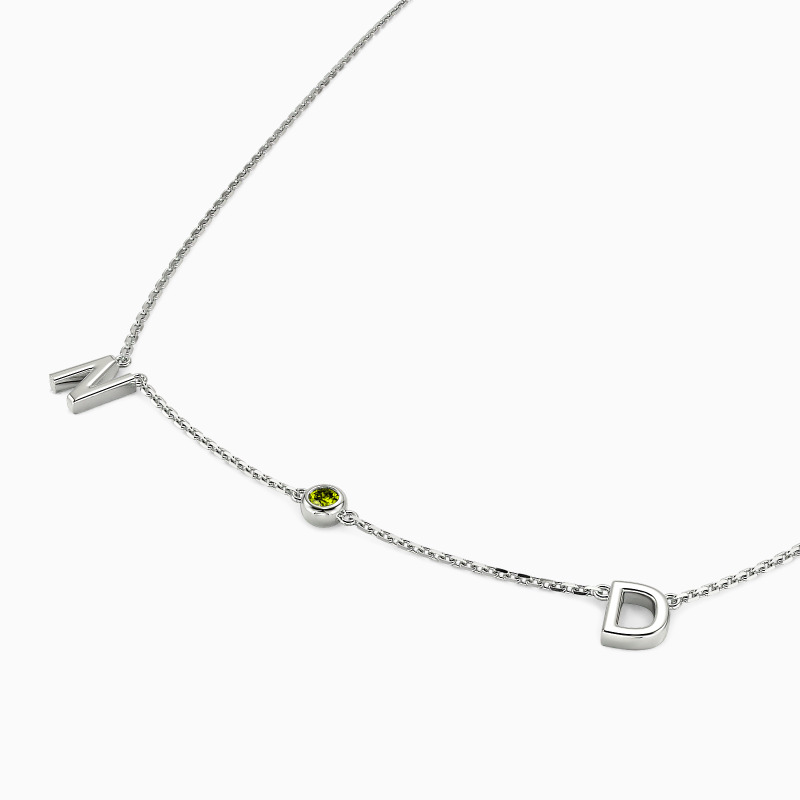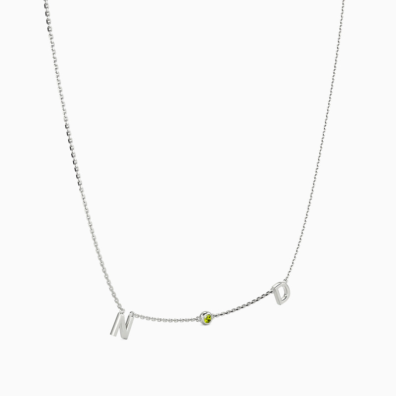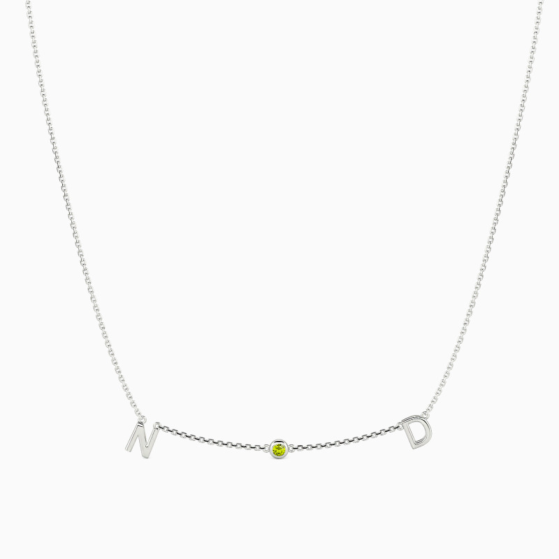 Subtle yet refined, this necklace delicately displays your personalized initials on each side of a round gemstone set in a smooth bezel mount. Elegantly crafted to allow your signature initials to shine alongside a centered gem, this necklace ensures your personal touch shows with understated sophistication, whether dressing up or down. Understated elegance meets your individual flair.