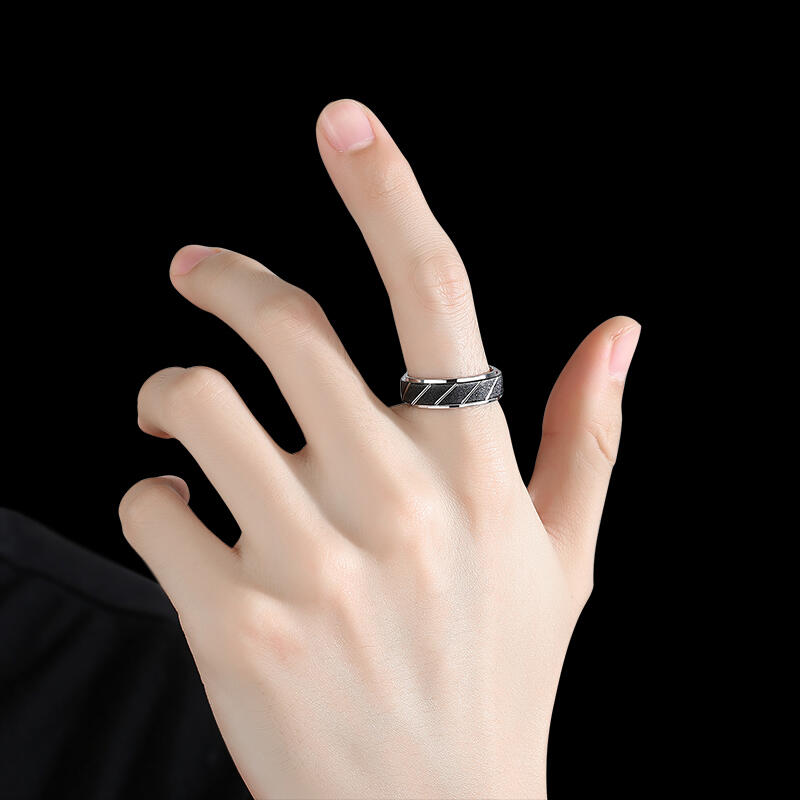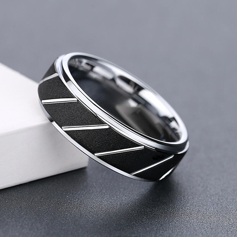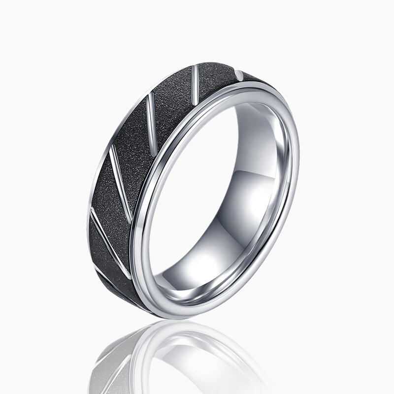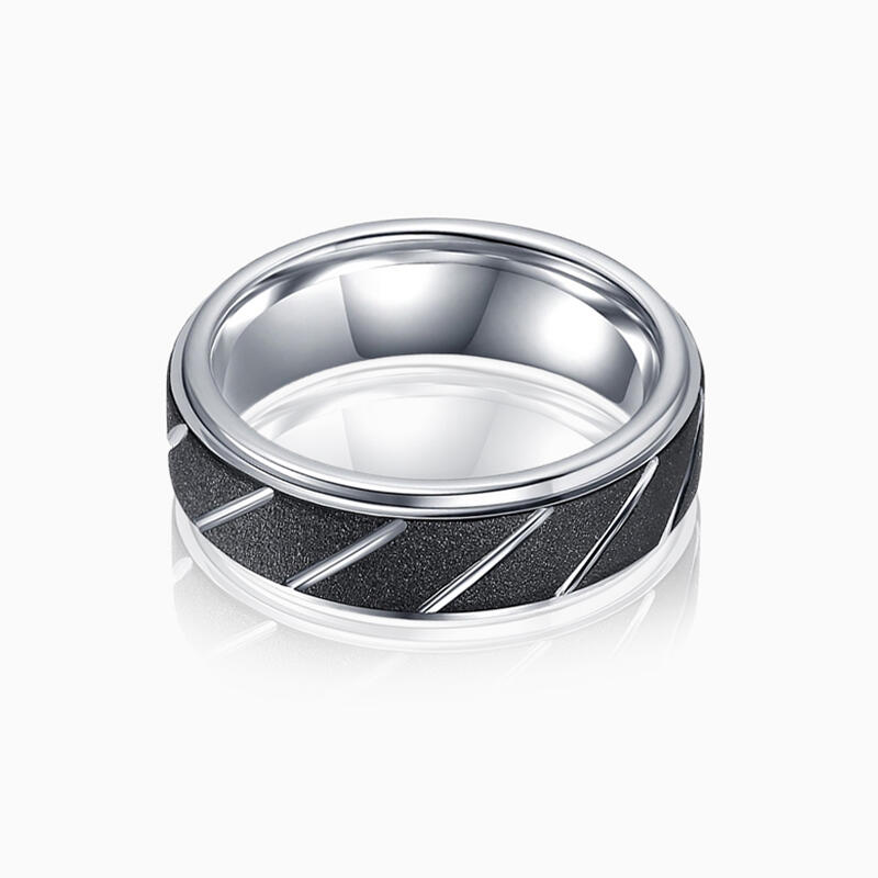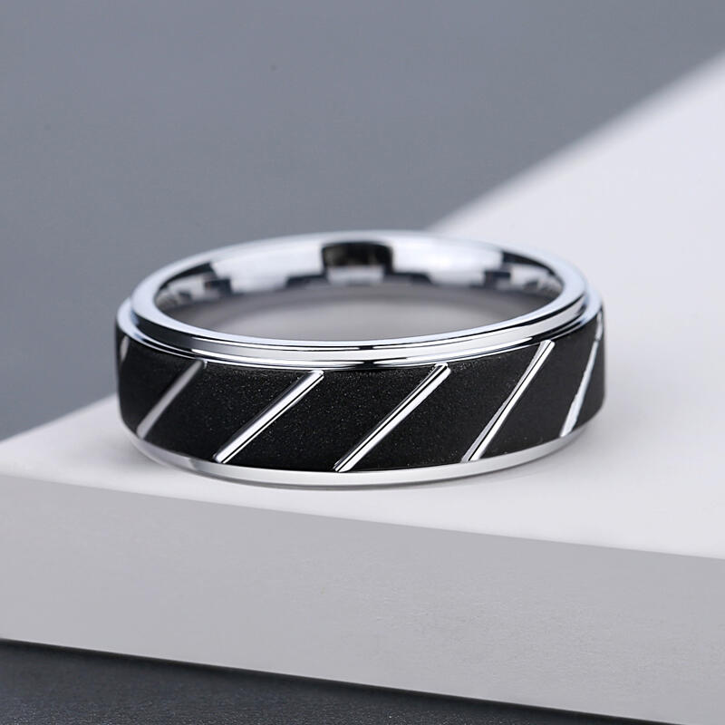 This striking men's wedding band showcases a bold, contemporary design. The ring's surface features intriguing sloping grooves that create a dynamic, sculptural effect. These grooves add depth and visual interest, catching the light in subtle ways as the ring moves. The black frosted finish gives the band a sophisticated, matte appearance, evoking a sense of understated elegance and modern masculinity.