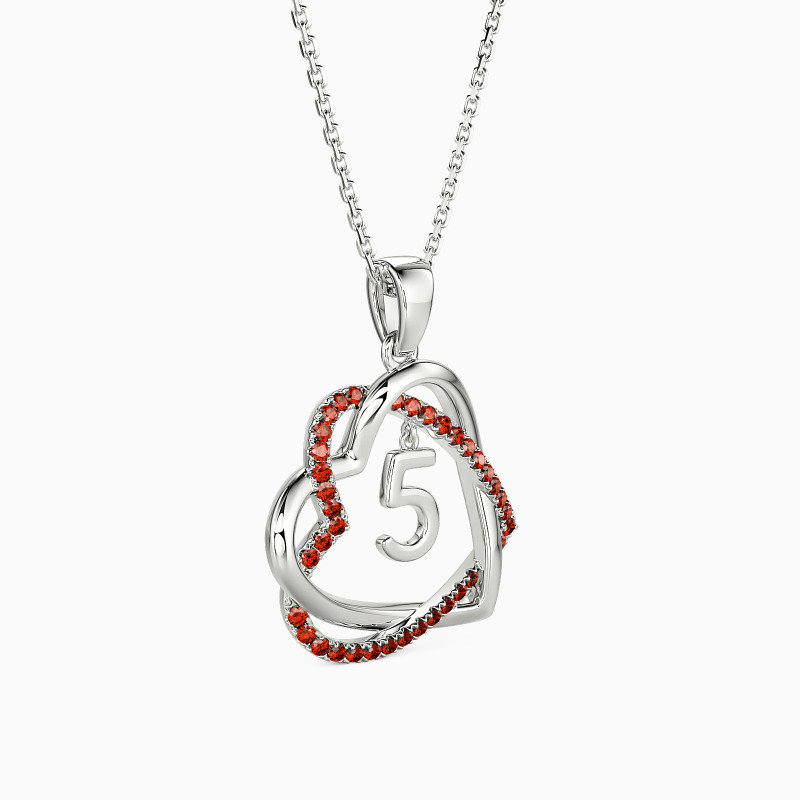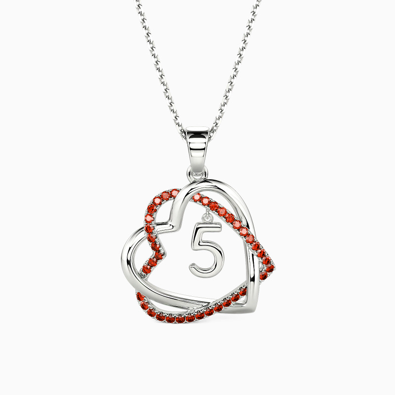 This intricately crafted pendant delicately embraces the theme of love. It features two entwined hearts elegantly paved with round gemstones along the contours. Besides, a customizable number dangles in the center of the hearts. An ideal gift to express love or commemorate an important date, this pendant delivers beauty through its intricate design that will surely be treasured for years to come.