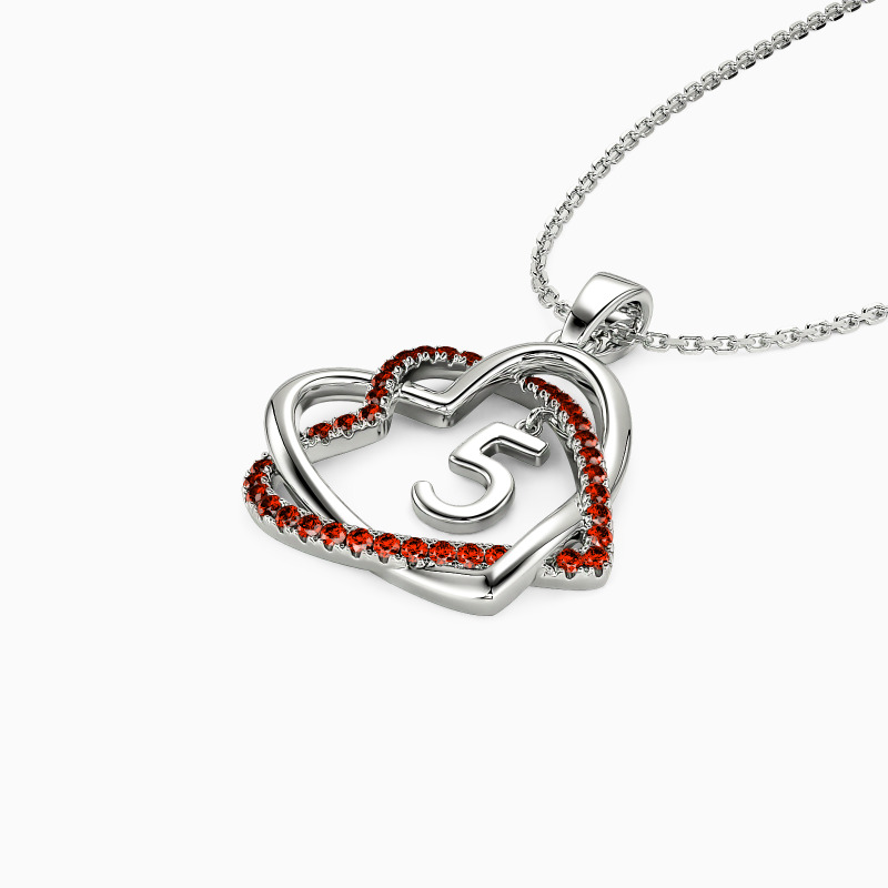 This intricately crafted pendant delicately embraces the theme of love. It features two entwined hearts elegantly paved with round gemstones along the contours. Besides, a customizable number dangles in the center of the hearts. An ideal gift to express love or commemorate an important date, this pendant delivers beauty through its intricate design that will surely be treasured for years to come.