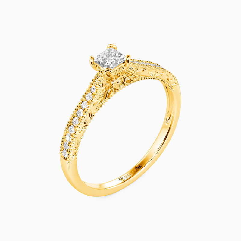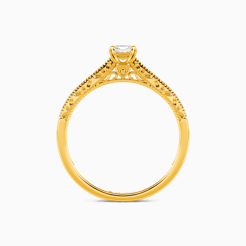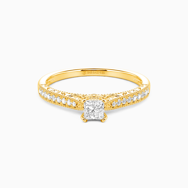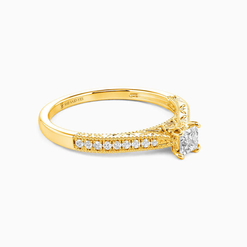 This exquisite side-stone engagement ring features a princess-cut center stone, framed by delicate accents for a radiant glow. The cathedral shoulders gracefully ascend, adorned with intricate milgrain detailing and romantic leaf engravings along the profile—symbolizing growth and eternal love. A timeless blend of vintage charm and modern sophistication, perfect for a love that flourishes.