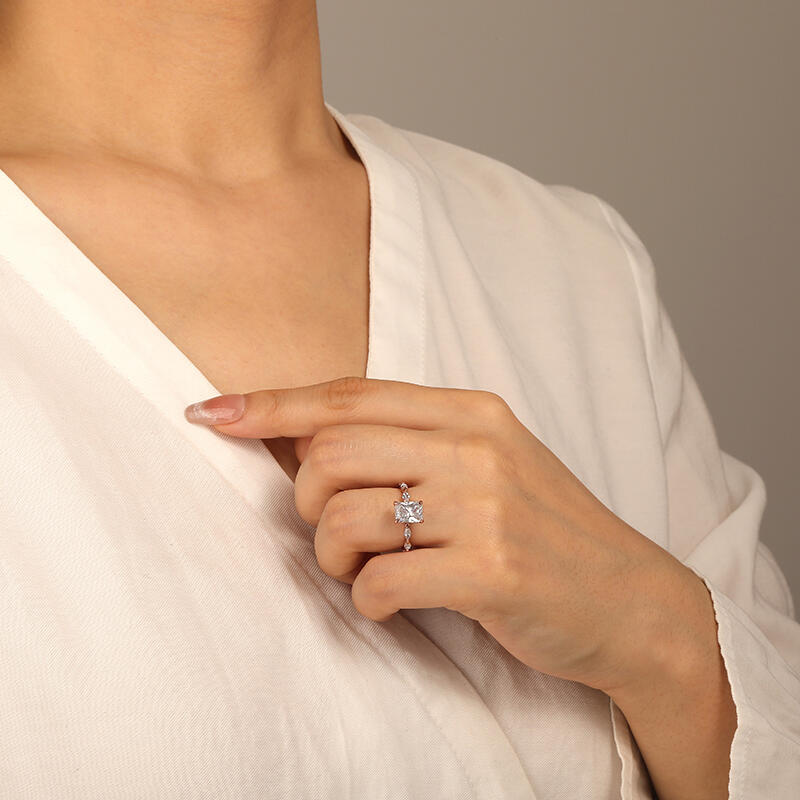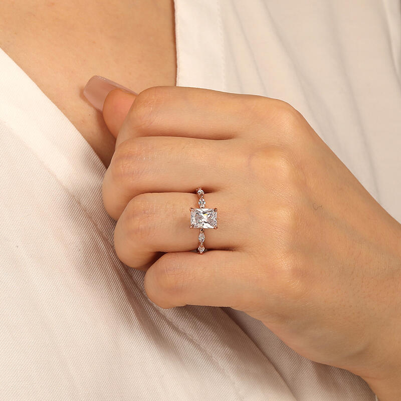 Experience elegance redefined with this side-stone engagement ring. The centerpiece boasts an exquisite radiant-cut stone, elevated by a hidden halo that adds a touch of mystique and brilliance. The shank is adorned with marquise-cut gems, further enhancing the ring's overall sophistication. More than just a ring, this piece symbolizes commitment and love, meticulously crafted for those who appreciate timeless elegance and unique design.