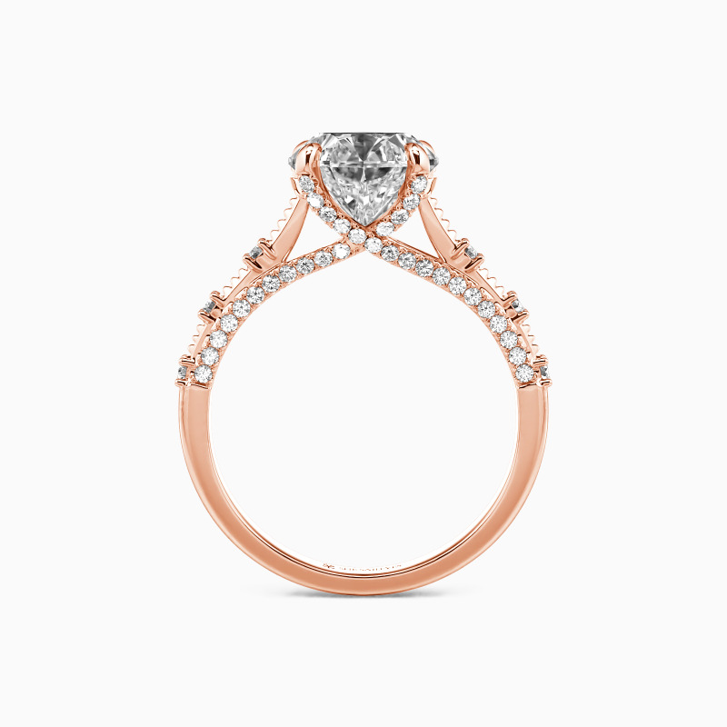 Radiant and enchanting, this side-stone engagement ring showcases a dazzling heart-cut center stone. Nestled within a cathedral-inspired setting and embellished with a delicate crossover design, this ring epitomizes sophistication and grace. The intricately detailed shoulders, each adorned with three gems, symbolize a journey of love, loyalty, and devotion that knows no bounds.