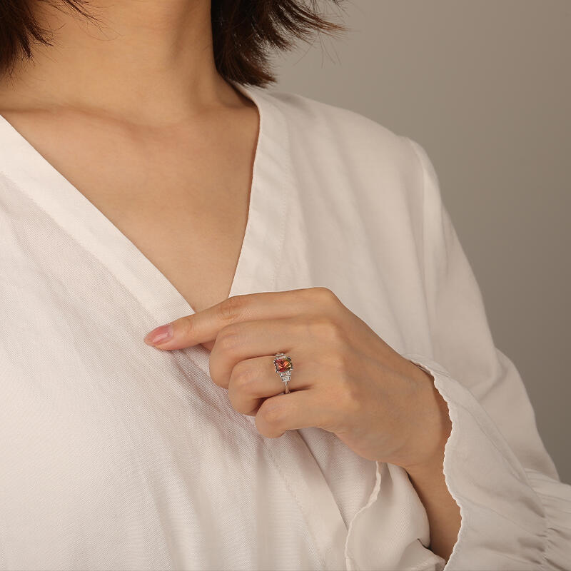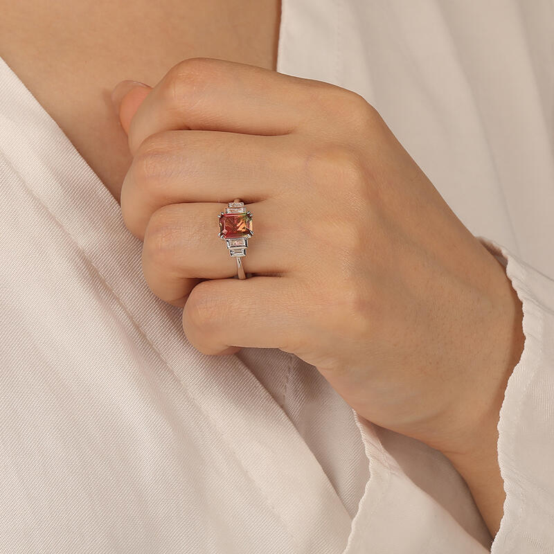 Elegant and sophisticated. It showcases an emerald-cut center stone, impeccably set in a double prong to amplify its striking allure. Flanking it are same emerald-cut side stones, artfully encased in bezel settings, enhancing the center stone's radiance. Meanwhile, the delicate profile detailing adds a unique charm to this timeless piece, making it an extraordinary symbol of eternal love and steadfast devotion.