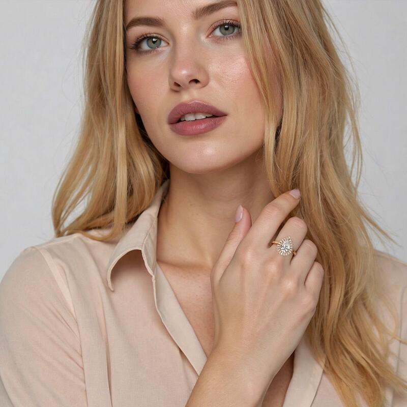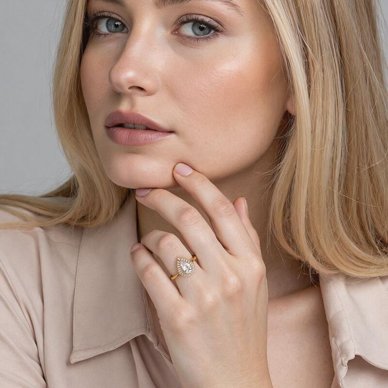 This exquisite halo engagement ring embodies elegance and sophistication, perfect for an unforgettable engagement. It boasts a pear-cut center stone, expertly crafted to maximize its brilliance and soft curves. A stunning halo of trapezoidal-cut gemstones encases the centerpiece, adding an extra layer of sophistication and sparkle. This ring evokes a sense of timeless elegance and romance, making it the perfect symbol of lasting love.