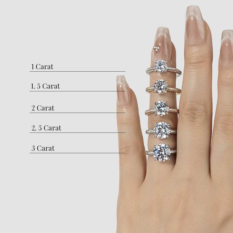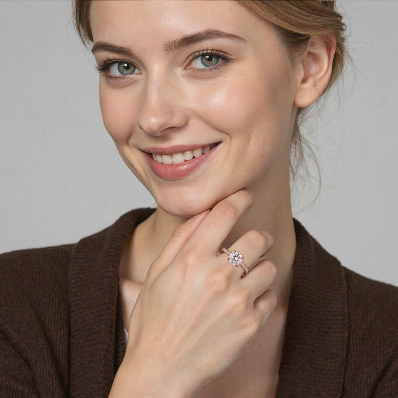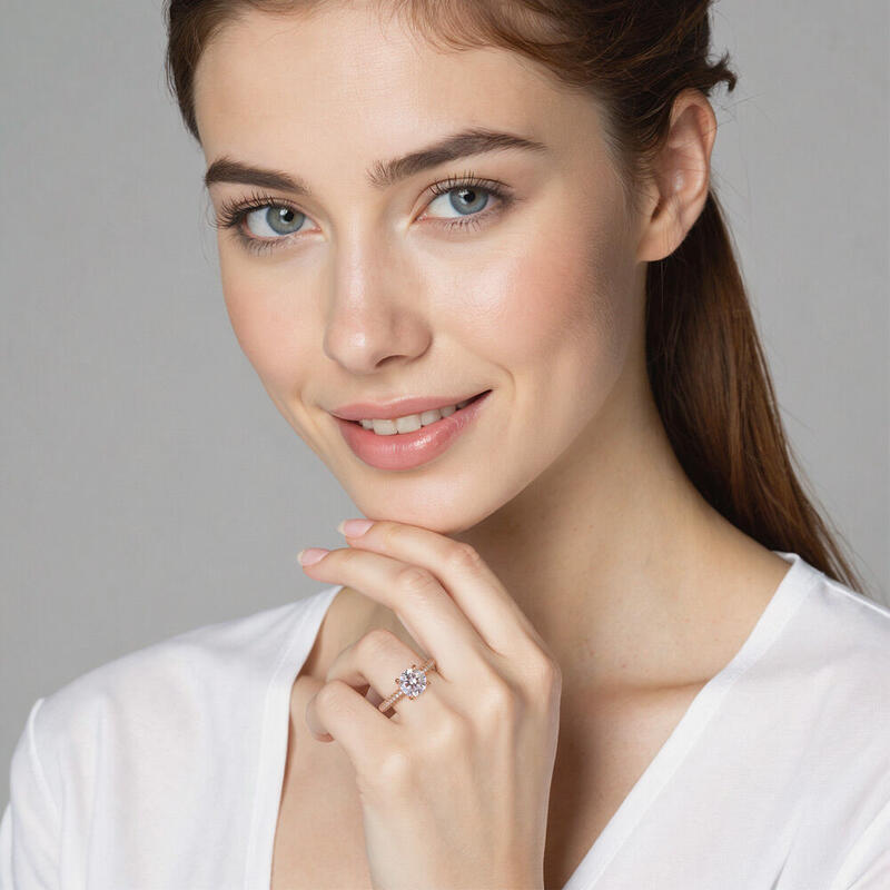 Lighting up your eyes with unparalleled brilliance, our fine side stone engagement ring features a dazzling round gem in sleek four-claws on a domed shank. With numerous gems tidily decorating the head of the ring, it presents a breathtaking fineness with a touch of modernity that will fit any style of a woman.