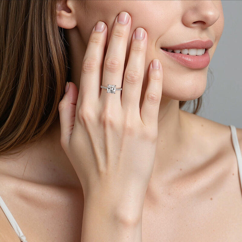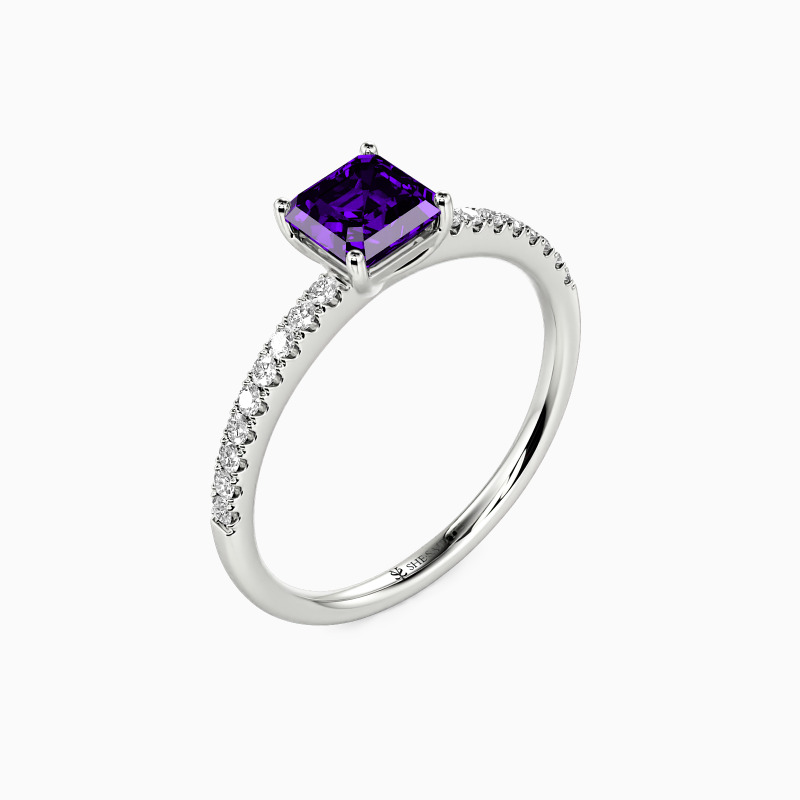 Classic and sophisticated. This engagement ring features a dazzling Asscher cut stone shines at the center, while additional stones sparkle on the ring's shank for extra shimmer. Promise to love her for a lifetime when you present her with this elegant engagement ring.