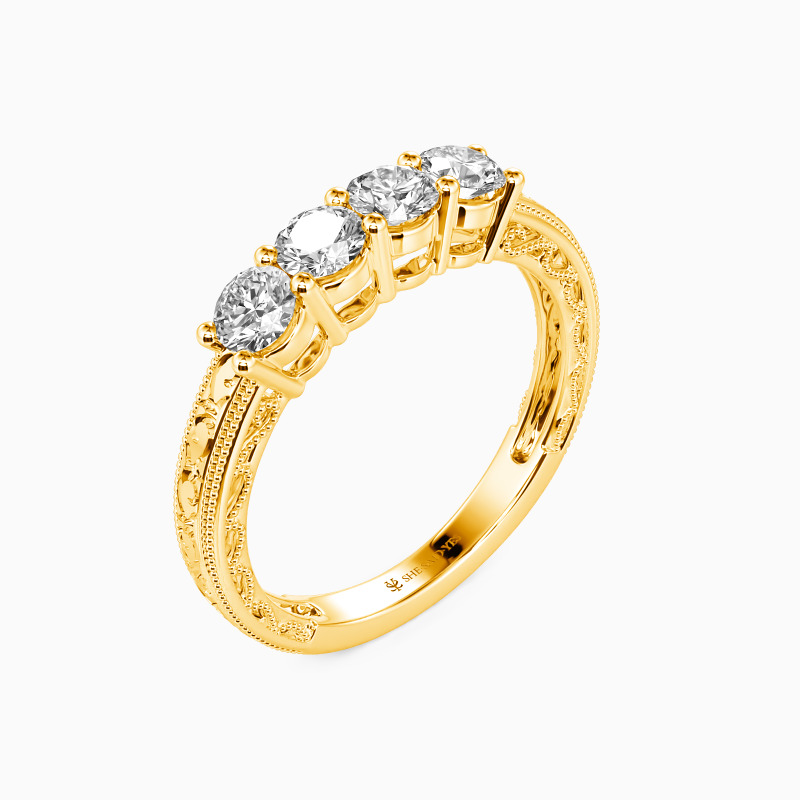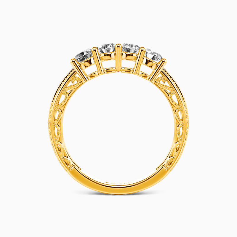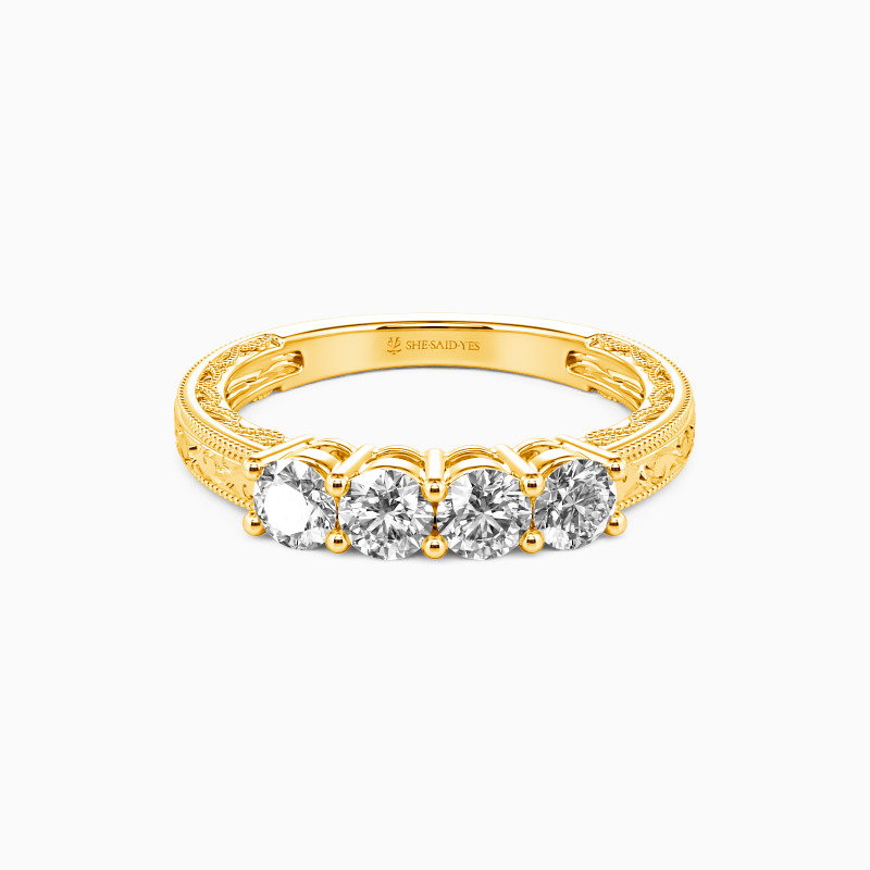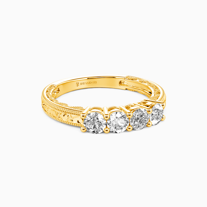 A vintage-inspired wedding band with delicate charm, featuring four round stones set in a gracefully hollow profile. Intricate milgrain edges and carved vine motifs whisper timeless romance, while the open design lends an airy elegance. A perfect blend of old-world artistry and modern lightness—ideal for those who adore heirloom details with a contemporary touch.