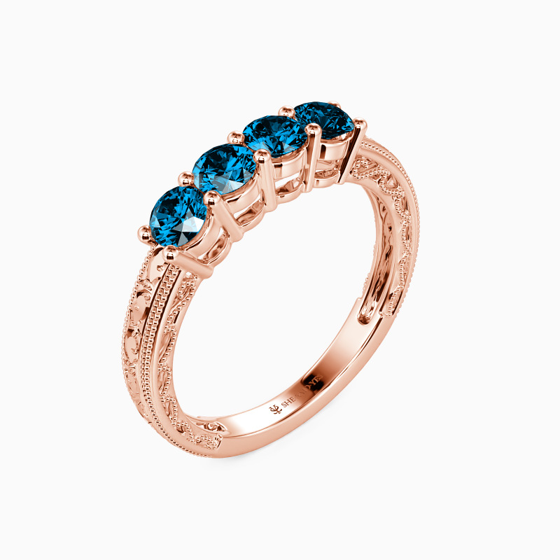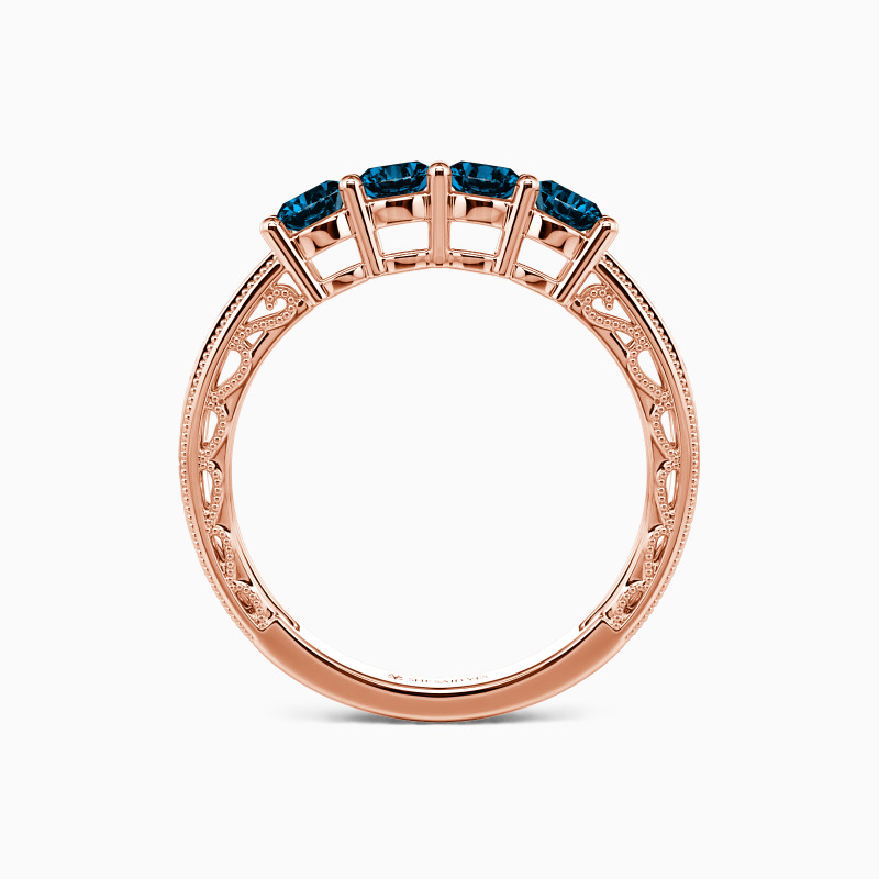 A vintage-inspired wedding band with delicate charm, featuring four round stones set in a gracefully hollow profile. Intricate milgrain edges and carved vine motifs whisper timeless romance, while the open design lends an airy elegance. A perfect blend of old-world artistry and modern lightness—ideal for those who adore heirloom details with a contemporary touch.