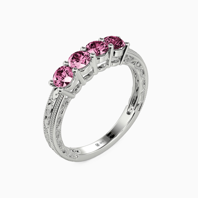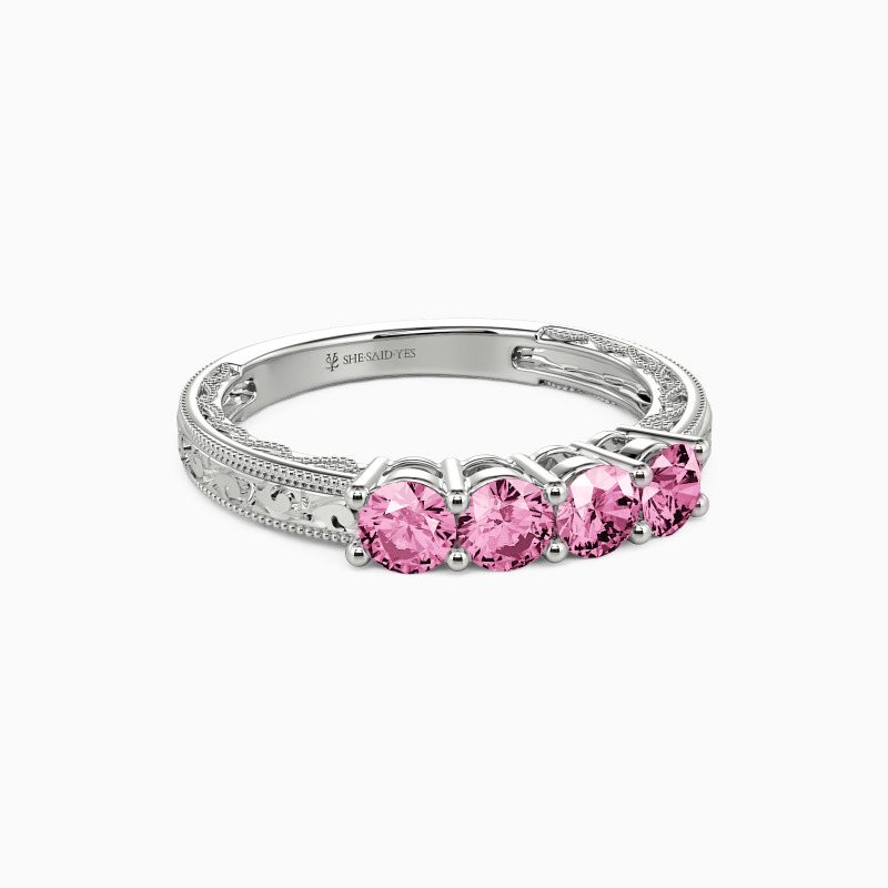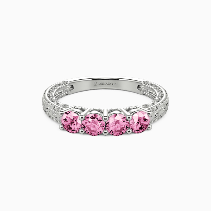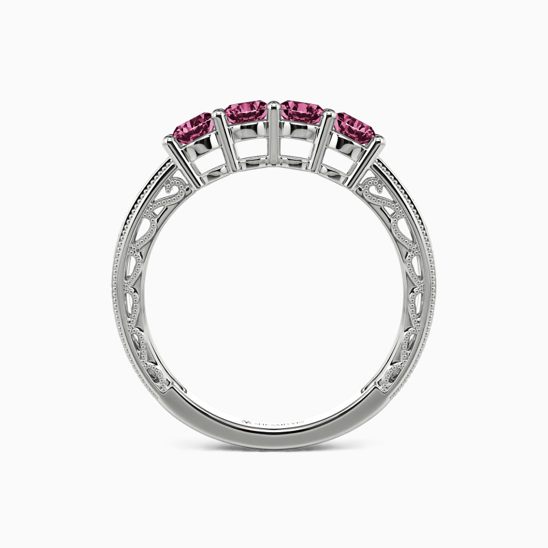 A vintage-inspired wedding band with delicate charm, featuring four round stones set in a gracefully hollow profile. Intricate milgrain edges and carved vine motifs whisper timeless romance, while the open design lends an airy elegance. A perfect blend of old-world artistry and modern lightness—ideal for those who adore heirloom details with a contemporary touch.