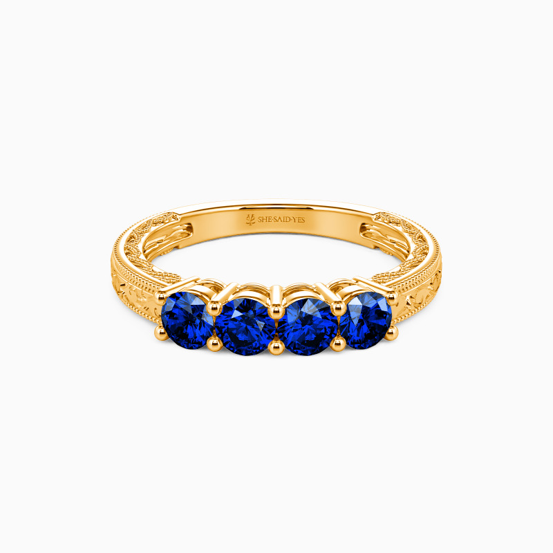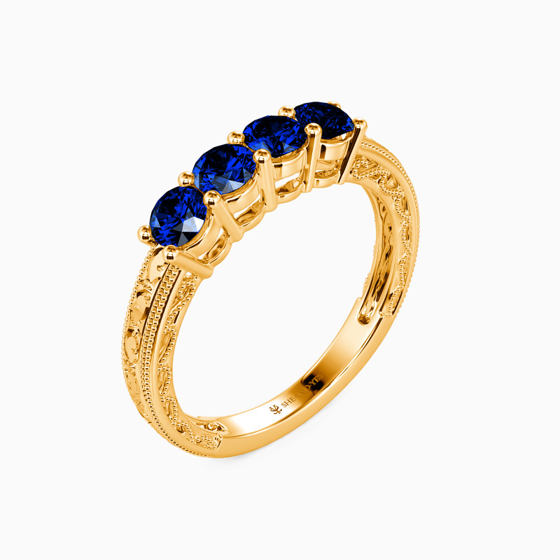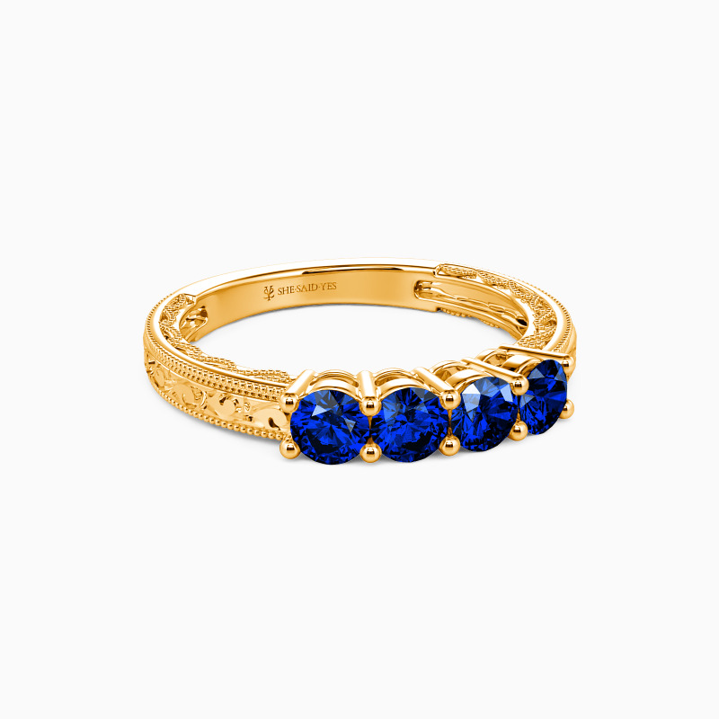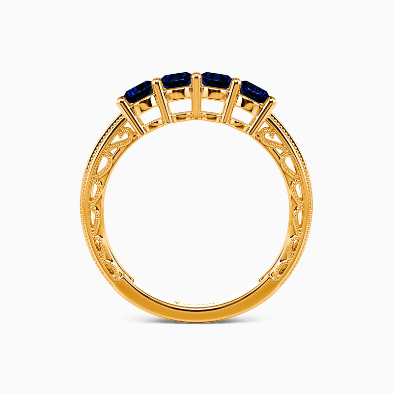 A vintage-inspired wedding band with delicate charm, featuring four round stones set in a gracefully hollow profile. Intricate milgrain edges and carved vine motifs whisper timeless romance, while the open design lends an airy elegance. A perfect blend of old-world artistry and modern lightness—ideal for those who adore heirloom details with a contemporary touch.