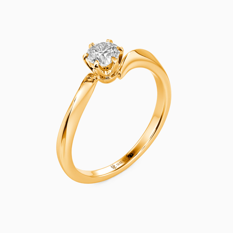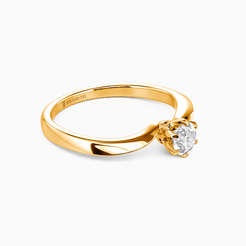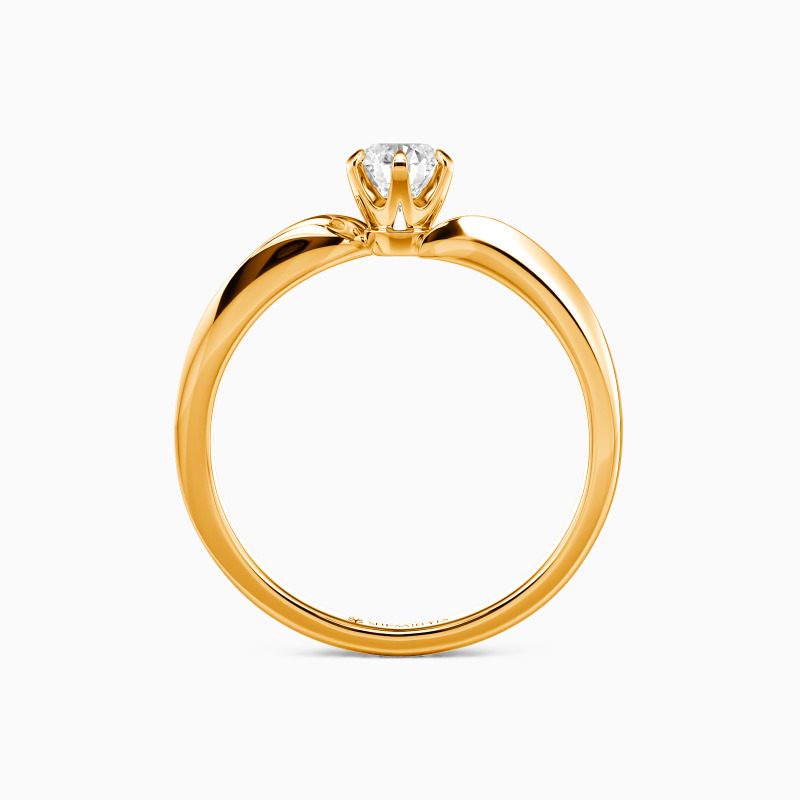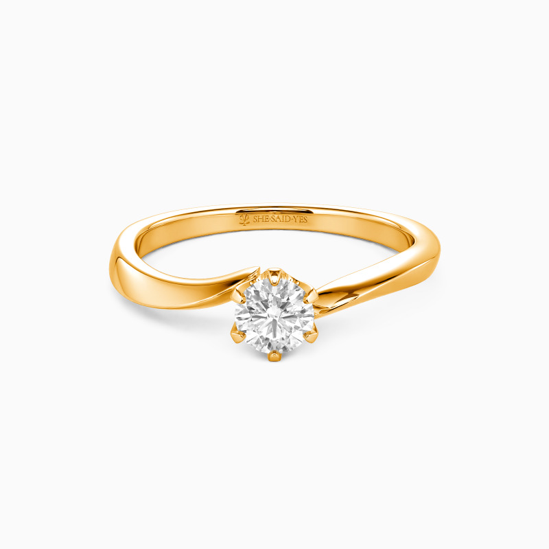 A radiant round-cut center stone takes center stage in this elegant solitaire engagement ring, secured by a sleek six-prong setting for timeless brilliance. The shank curves in a soft, wave-like bypass design, lending movement and modernity to a classic silhouette. A perfect balance of tradition and contemporary romance, this ring symbolizes love's eternal flow.