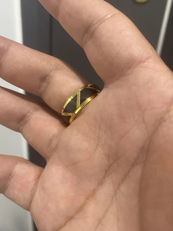 This sophisticated men's wedding band combines black and gold for a striking two-tone effect, blending modern elegance with timeless appeal. The brushed grooves add texture and depth, creating a rugged yet refined aesthetic, while the step-edge design introduces a sleek, architectural element that enhances the band's masculine profile.
