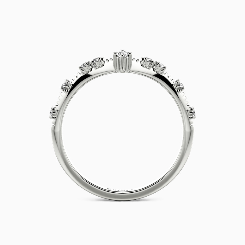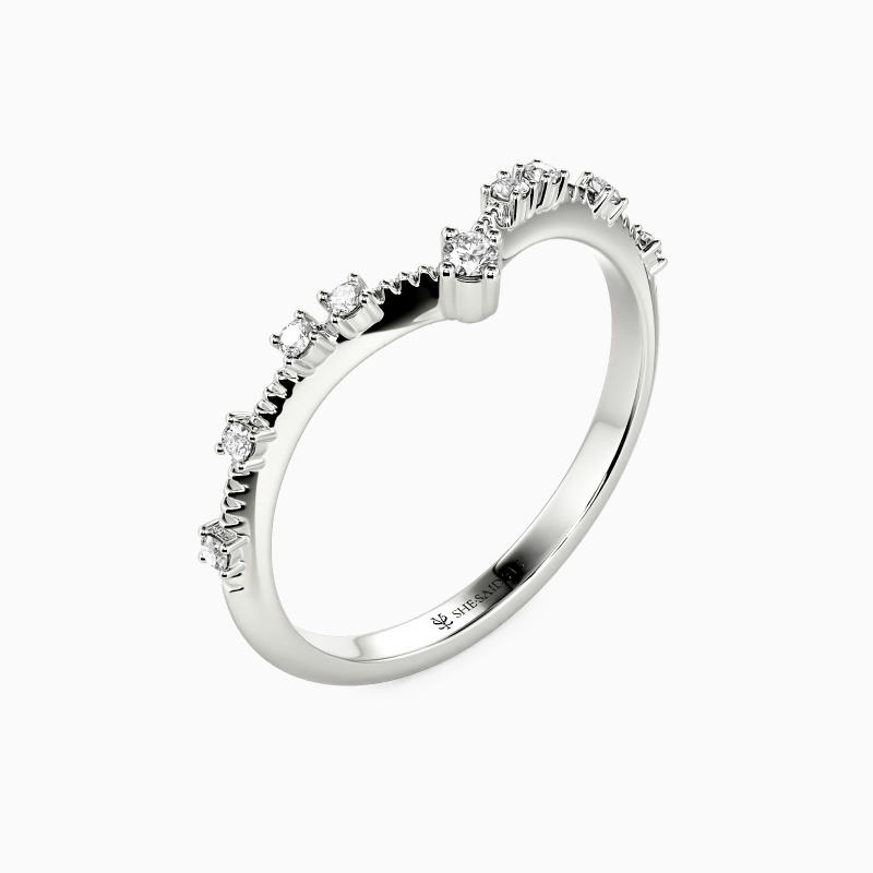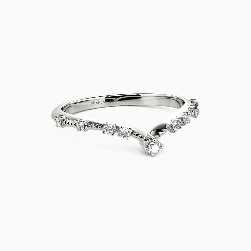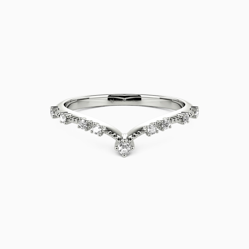 This exquisite wedding ring features a graceful V-shape design, adorned with sparkling gems delicately placed along its meticulously crafted shank. In addition, a round gemstone delicately adorns the ring at the V's tip, resembling a subtle crown. Versatile in design, it can be worn solo or paired with an engagement ring for a captivating stack. Experience the perfect blend of sophistication and versatility with this enchanting piece.