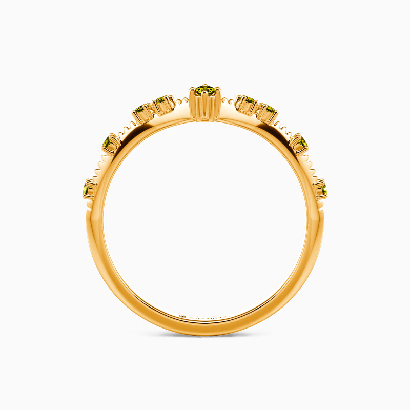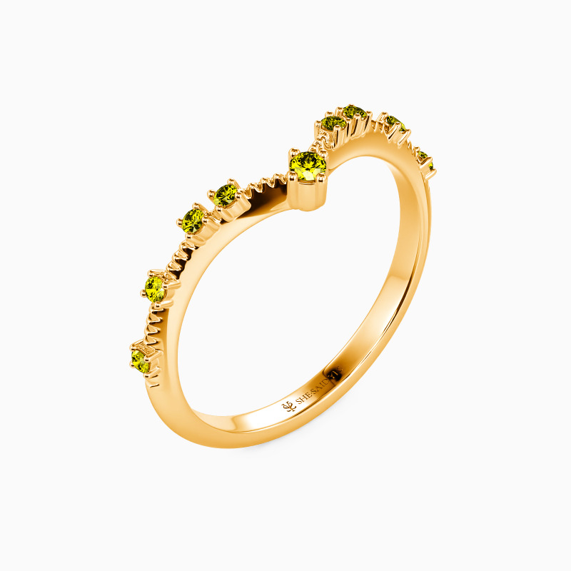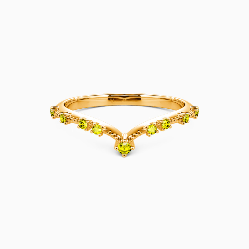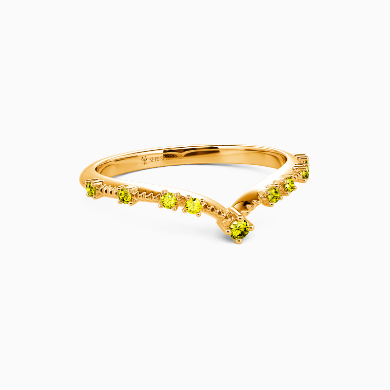 This exquisite wedding ring features a graceful V-shape design, adorned with sparkling gems delicately placed along its meticulously crafted shank. In addition, a round gemstone delicately adorns the ring at the V's tip, resembling a subtle crown. Versatile in design, it can be worn solo or paired with an engagement ring for a captivating stack. Experience the perfect blend of sophistication and versatility with this enchanting piece.