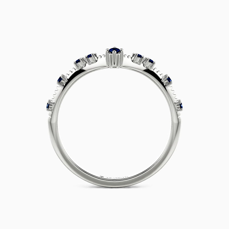 This exquisite wedding ring features a graceful V-shape design, adorned with sparkling gems delicately placed along its meticulously crafted shank. In addition, a round gemstone delicately adorns the ring at the V's tip, resembling a subtle crown. Versatile in design, it can be worn solo or paired with an engagement ring for a captivating stack. Experience the perfect blend of sophistication and versatility with this enchanting piece.