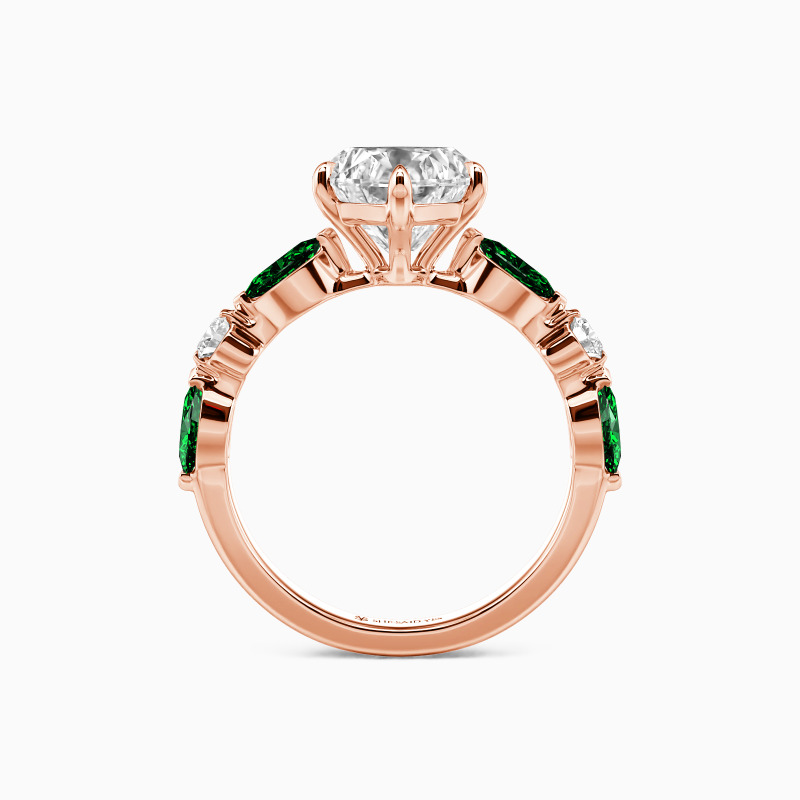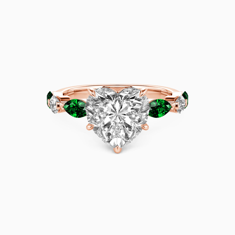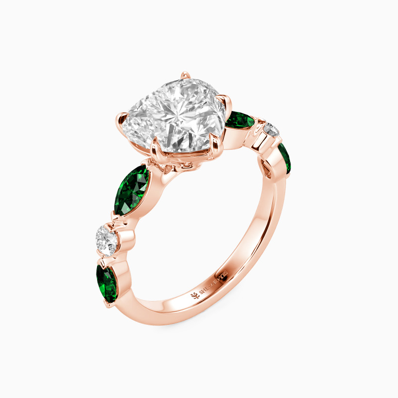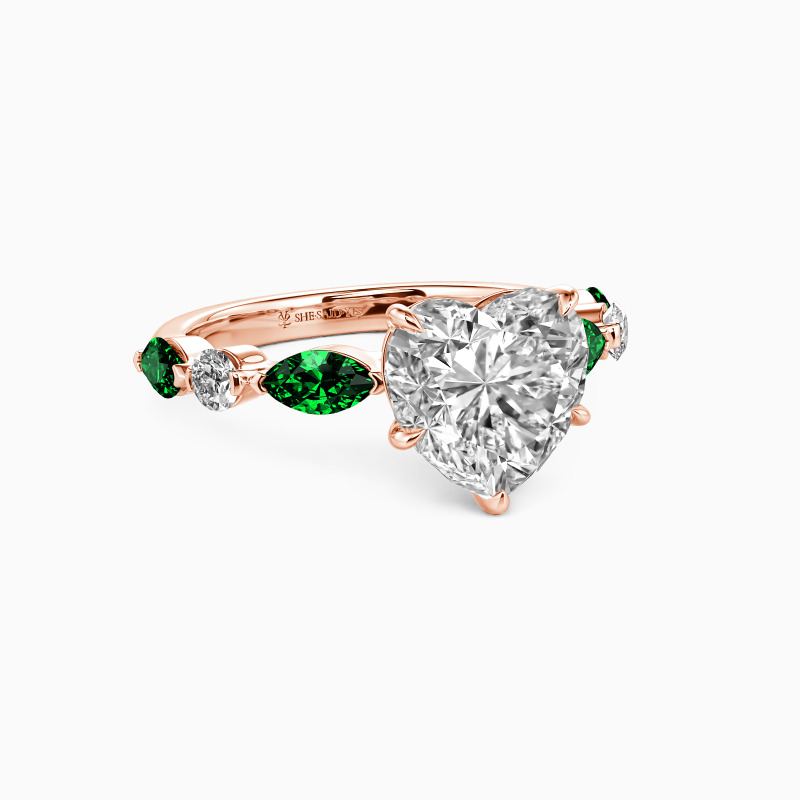 Embodying eternal love, this side-stone engagement ring features a heart-cut center stone, symbolizing the core of your affection. The band is beautifully adorned with alternating marquise and round side stones, adding a touch of elegance and sparkle. The design intricately weaves romance into every detail, making it a perfect testament to a love story that's uniquely yours.
