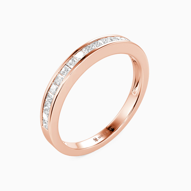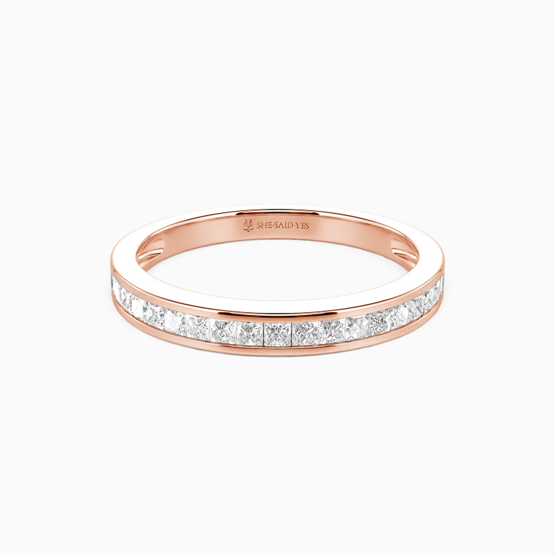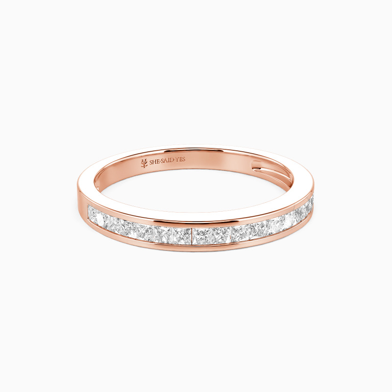 This elegant wedding band is the perfect symbol of enduring love. Its straight shank design offers timeless appeal, while channel-set gems add a touch of luxury. The princess-cut stones are securely nestled in a sleek channel setting, ensuring both beauty and durability. This band pairs beautifully with various engagement ring styles or shines brilliantly on its own.