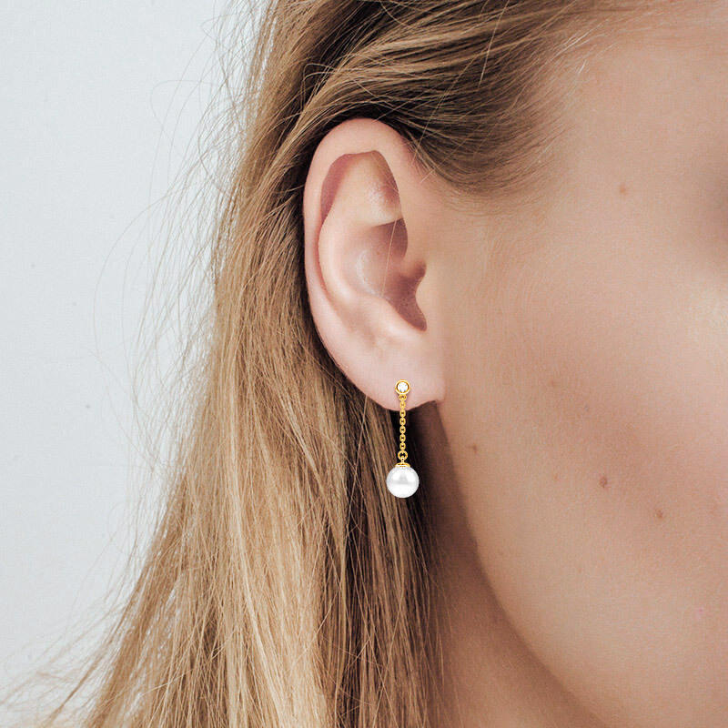 Effortlessly chic, these drop earrings showcase a round gemstone in a bezel setting, elegantly suspending a lustrous pearl. The gemstone's brilliance complements the pearl's soft glow, creating a harmonious balance of sparkle and shine. The pearl sways gently with every movement, adding a dynamic element to the design.