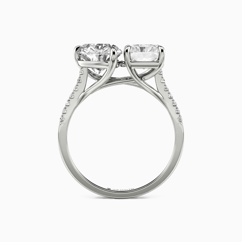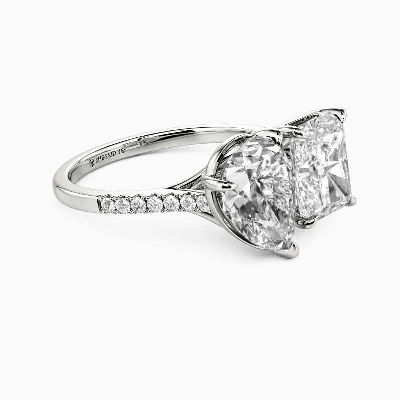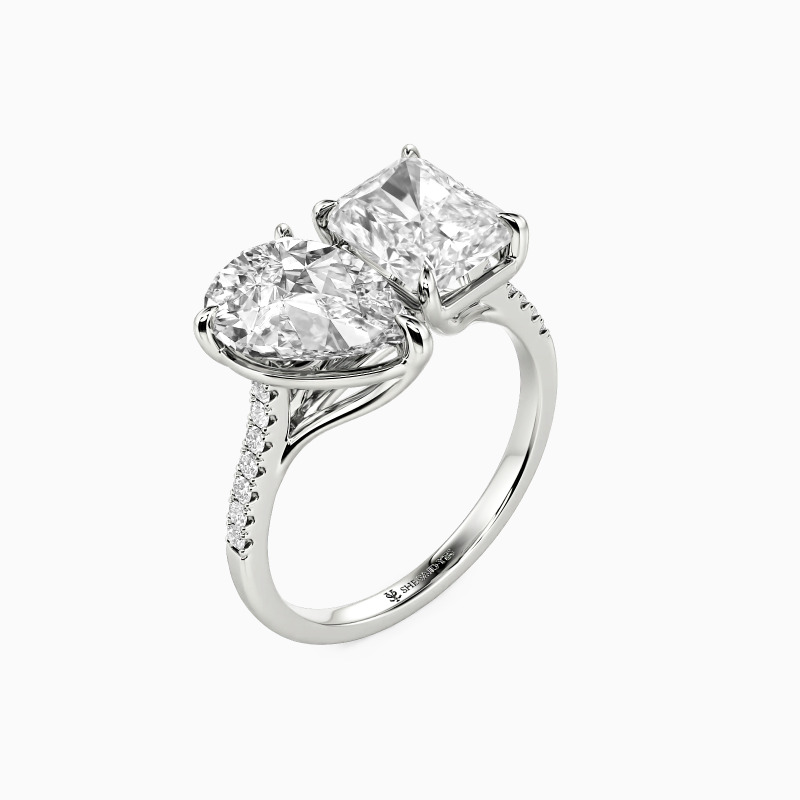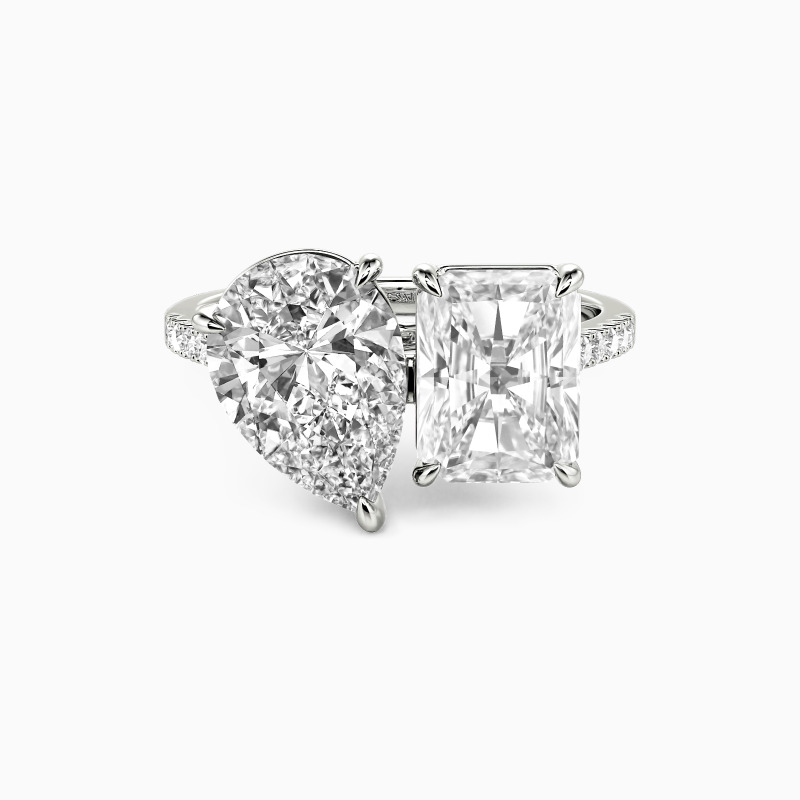 A masterpiece of love and individuality, this Toi et Moi ring pairs a radiant-cut gemstone with a pear-cut counterpart, their unique shapes intertwining in a dance of light and elegance. The meticulously paved shank enhances the piece's luxurious allure, making it a statement of timeless connection and modern artistry. Perfect for celebrating a bond as unique as its design.