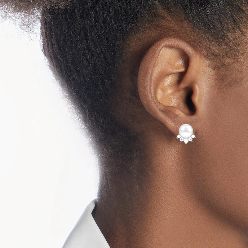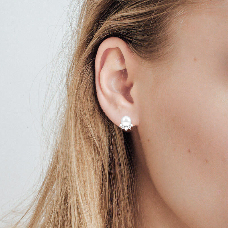 Enhance your style with these elegant pearl stud earrings, beautifully adorned with five sparkling round gems. The exquisite design offers a delicate balance of sophistication and radiance, making them a perfect accessory for any occasion. Add a touch of classic charm to your jewelry collection with these captivating pearl and gem earrings.