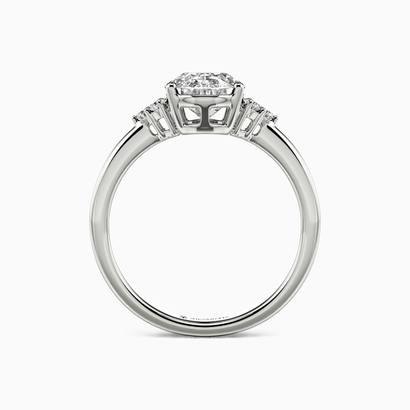 This side-stone engagement ring embodies timeless sophistication. At its heart lies a glittering oval-cut gem, surrounded by a trio of round-cut stones on each side. The complementary oval and round stones blend in a graceful feminine design that enhances the brilliance of the central piece. With its classic charm, this distinctive ring is designed to symbolize your love eternally.