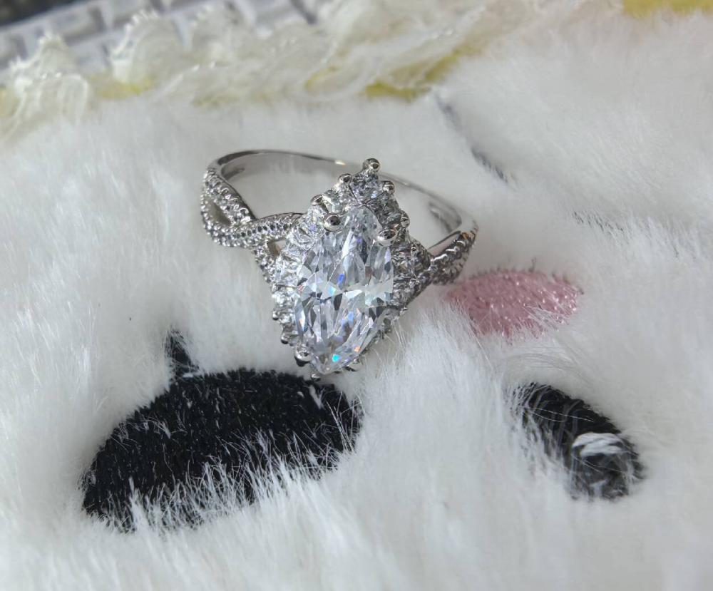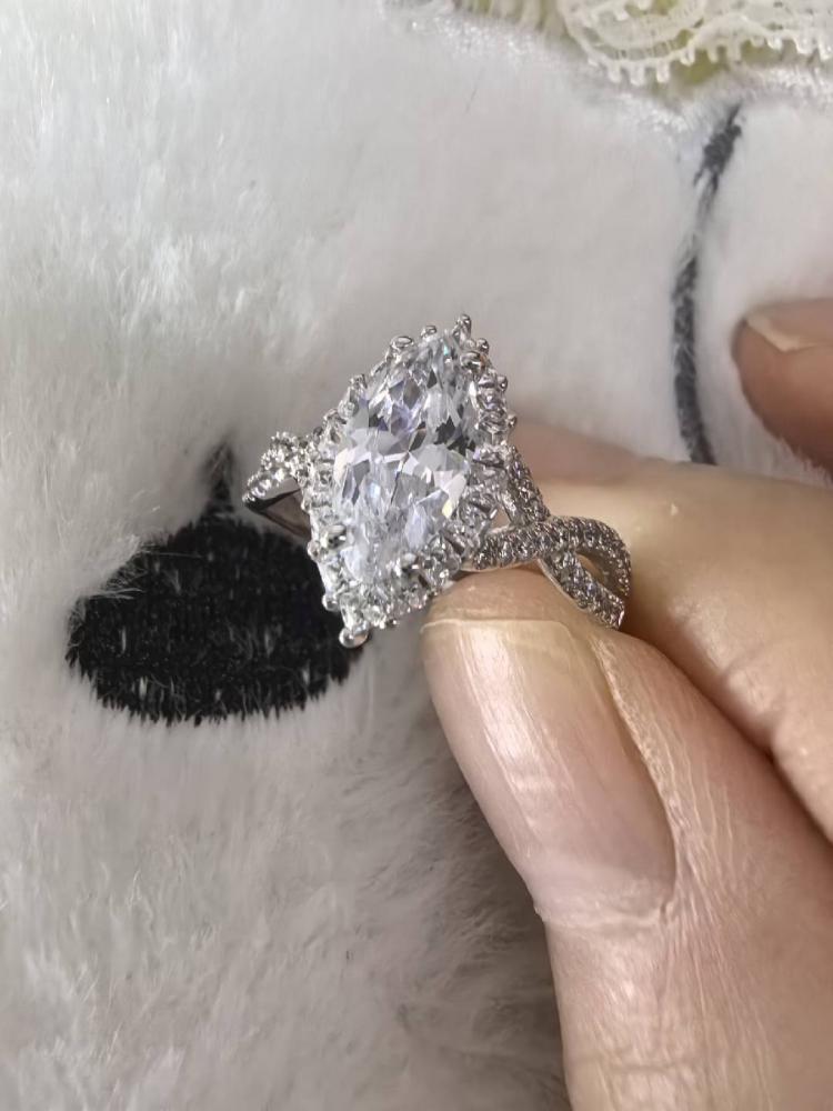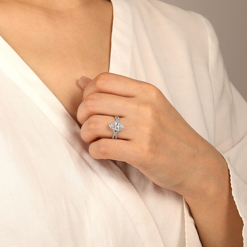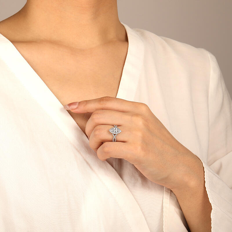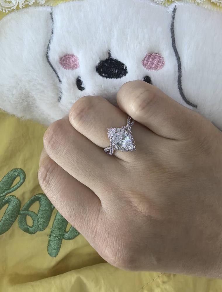 The infallible stunning engagement ring is perfect to create your first-time memory. Features a sizable marquise-cut gem shin with its unique radiance in the heart, a gleaming princess-cut halo elegantly wrapped in the center stone standing on the intertwined band with the shimmering stone-paved setting. This eye-grabbing art piece lends you a hint of retro sense.