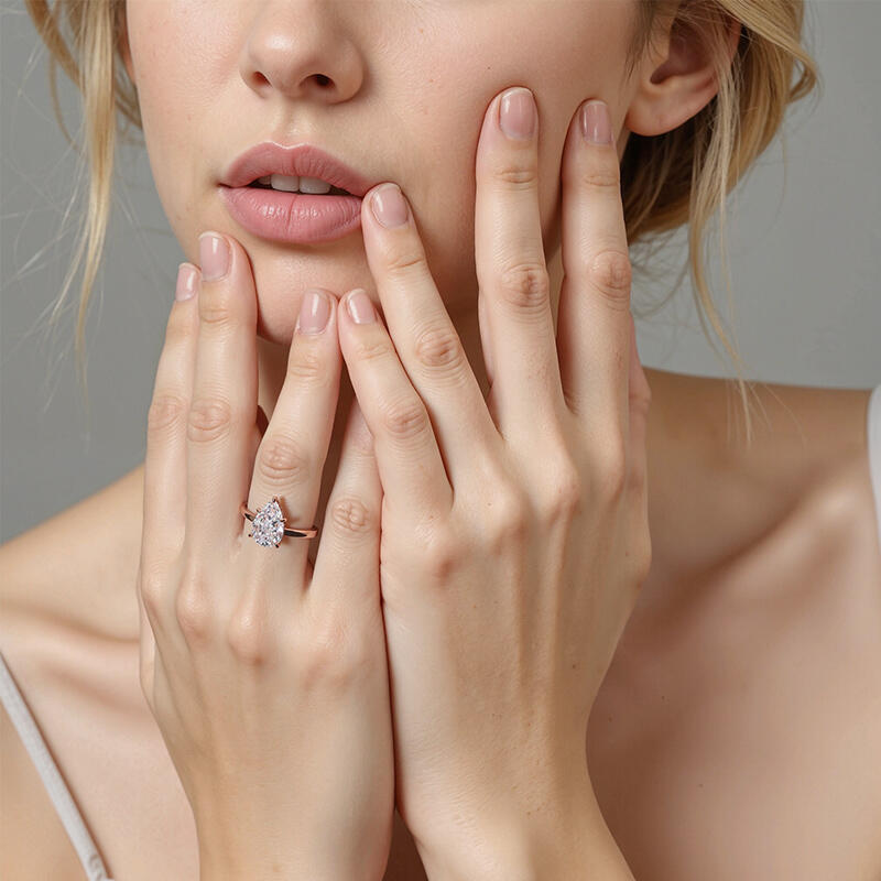 This elegant ring features a captivating pear-shaped center stone, held securely by four delicate prongs. Subtle yet sparkling accent stones adorn the main setting, enhancing its radiance. The polished band complements the overall design, creating a clean and modern look. This design harmoniously blends timeless elegance with contemporary style, creating a stunning symbol of enduring love.
