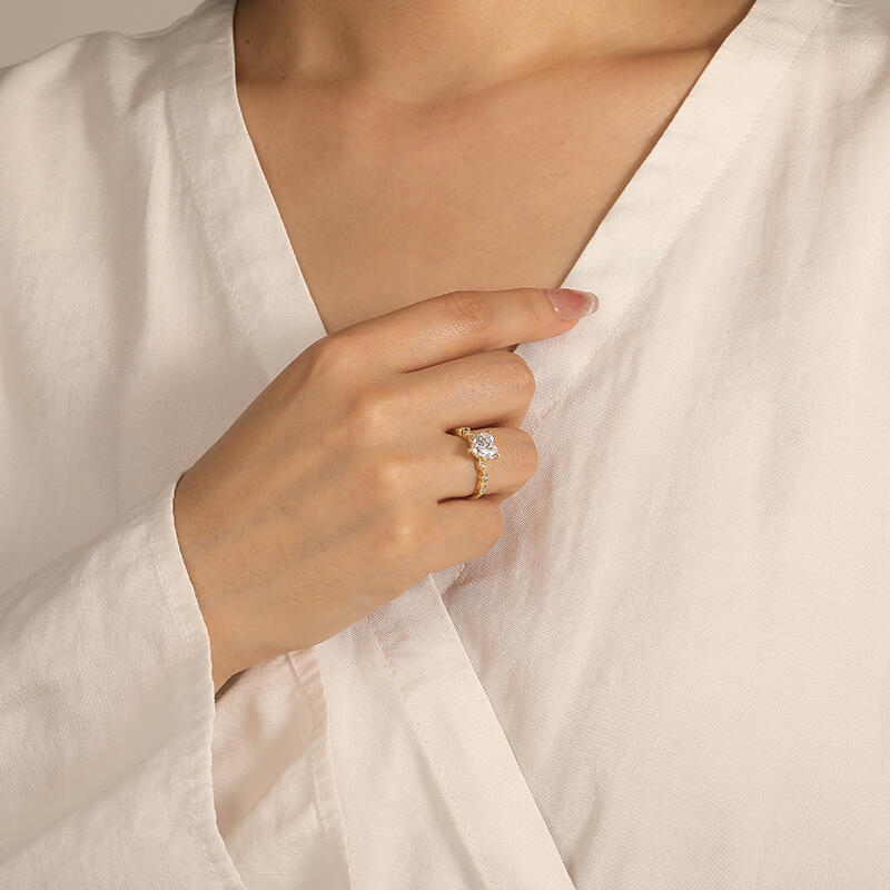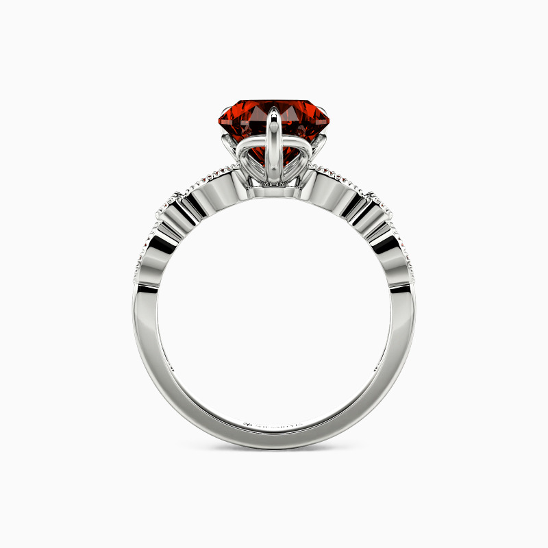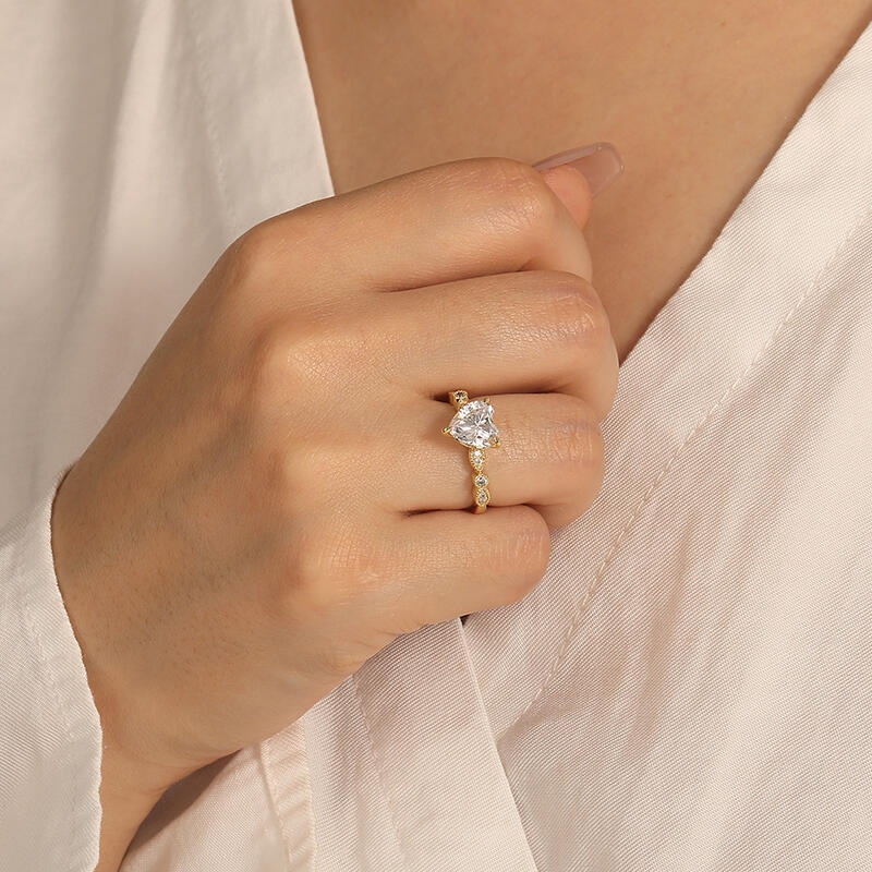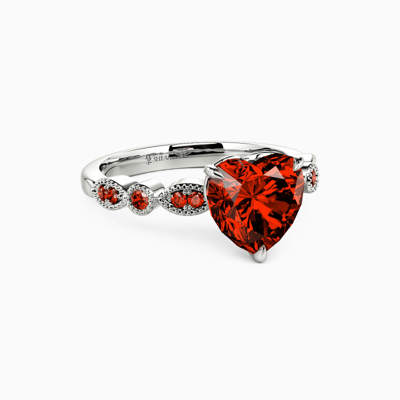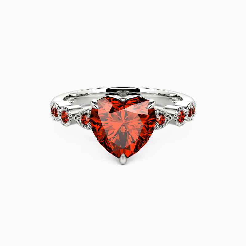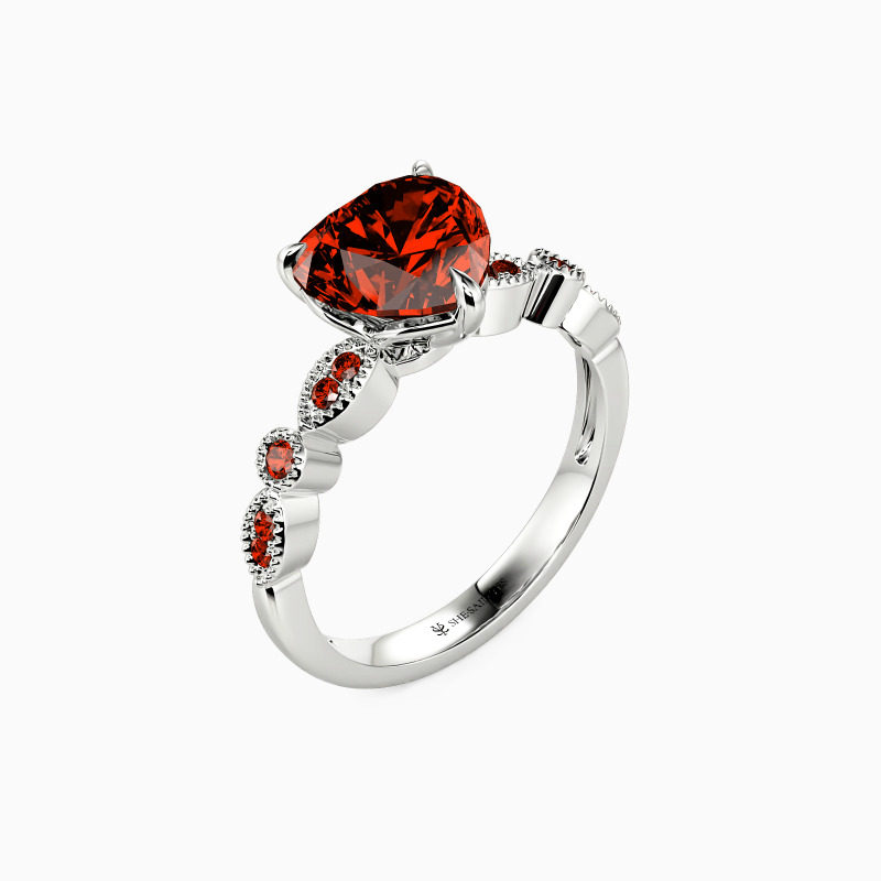 Classic and elegant, this side-stone engagement ring features a heart-cut center stone, exuding timeless romance. The scalloped band, adorned with round gems, beautifully complements the central piece, while the delicate milgrain detailing adds a touch of vintage charm. This piece is a testament to the timelessness of love, making it an ideal symbol for your lifelong commitment.
